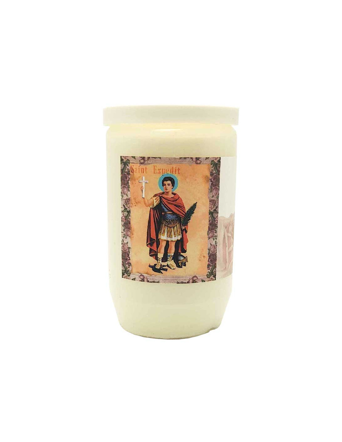 Dieses Öl-Grablicht ist dem Heiligen Expedit gewidmet, dem Schutzpatron der dringenden Anliegen. Es symbolisiert schnelle Hilfe, Entscheidungskraft und Unterstützung in Notlagen.