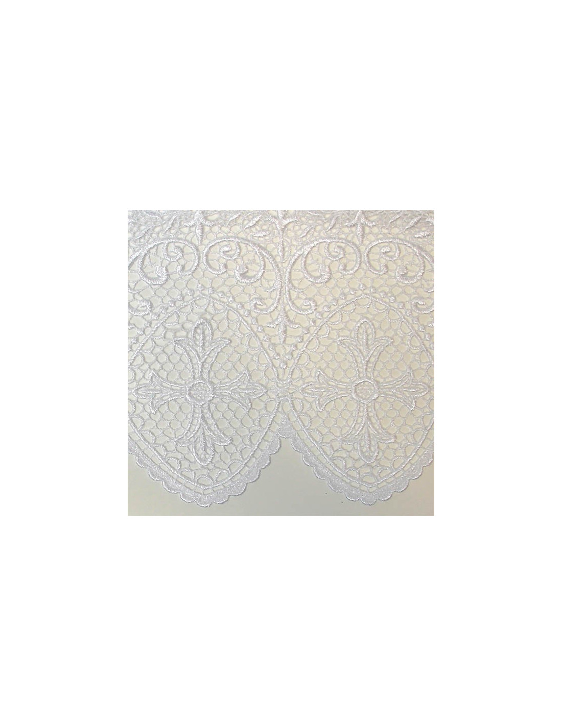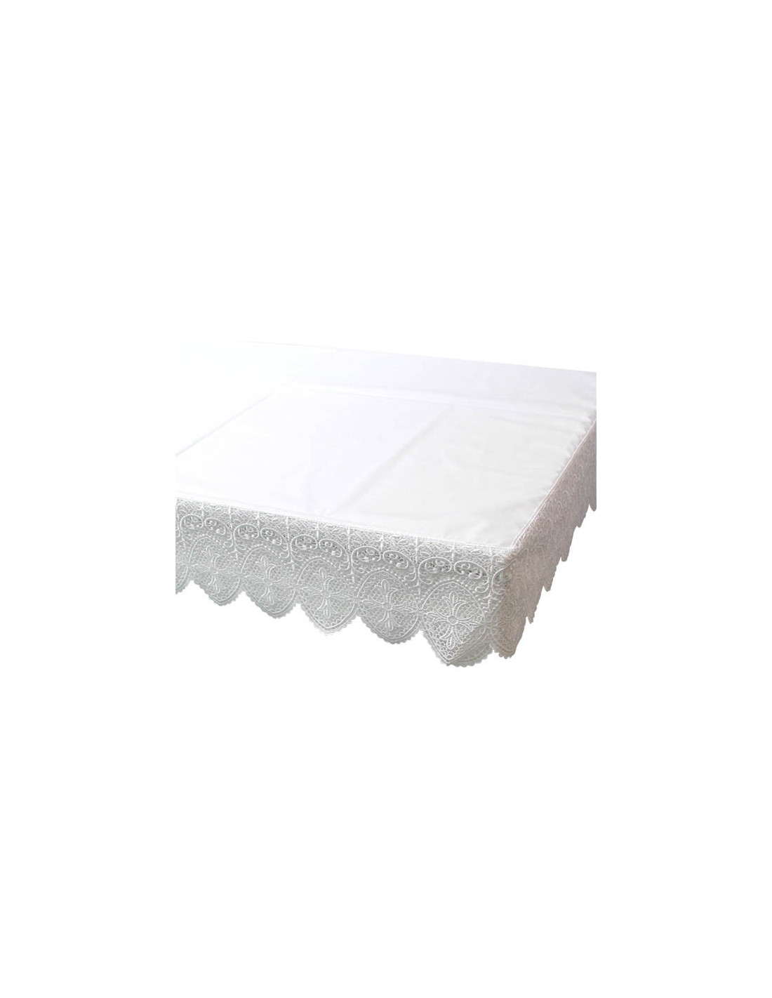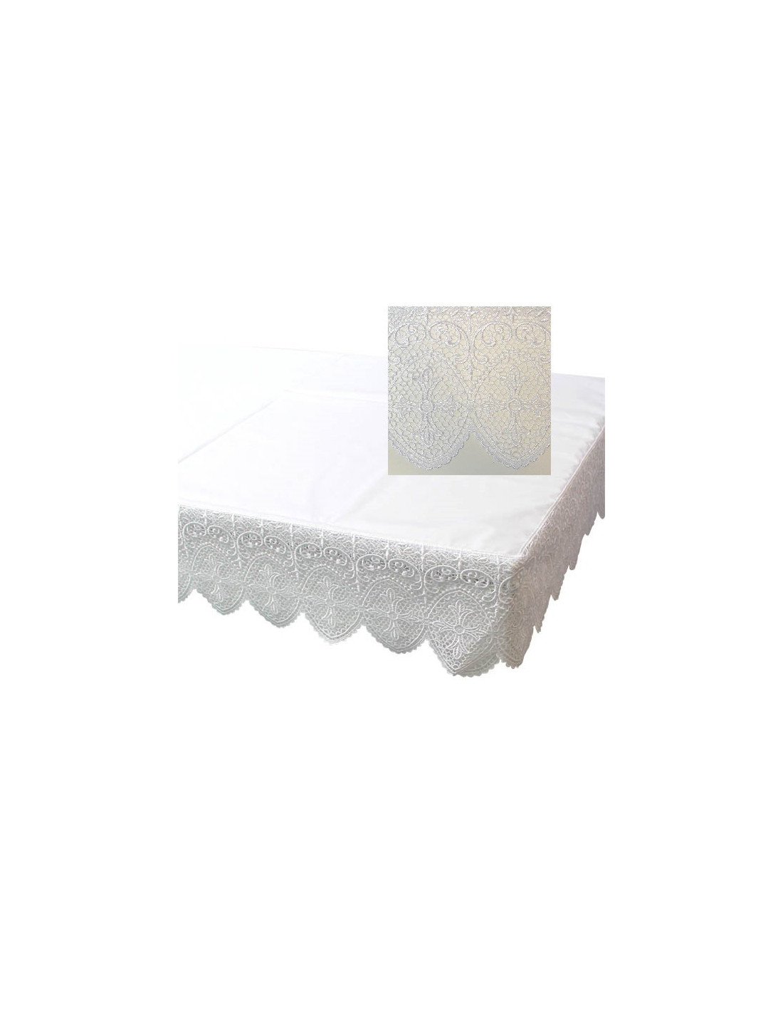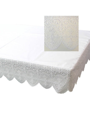 Wunderschöne Altartischdecke für den Gottesdienst. Die Tischdecke ist auf drei Seiten mit einem Kreuzfries bestickt, das in Häkelarbeit hergestellt wurde. Die Tischdecke und die Stickerei sind komplett weiß. Der Einfachheit halber ist der Stoff maschinenwaschbar.