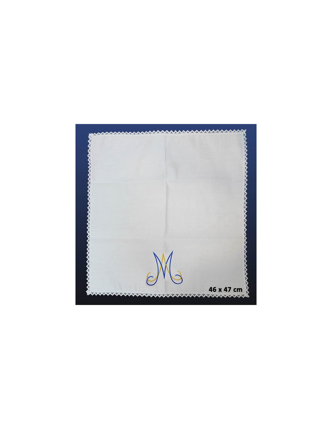 Dieses Messleinen-Set ist mit einem stilisierten M, dem Mariensymbol, bestickt, wobei sich goldene und blaue Fäden mischen. Alle sind mit einer Spitzenbordüre versehen. Das Ganze wurde in Handarbeit hergestellt.