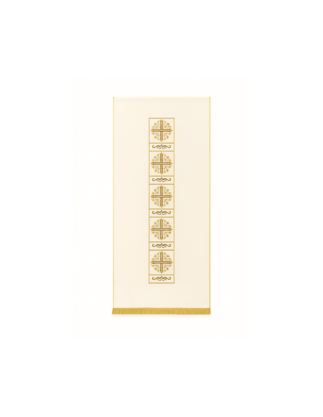 Der zentrale Streifen, verziert mit fein gestickten goldenen Kreuzen, erinnert an den Glauben, das göttliche Licht und das ewige Leben.