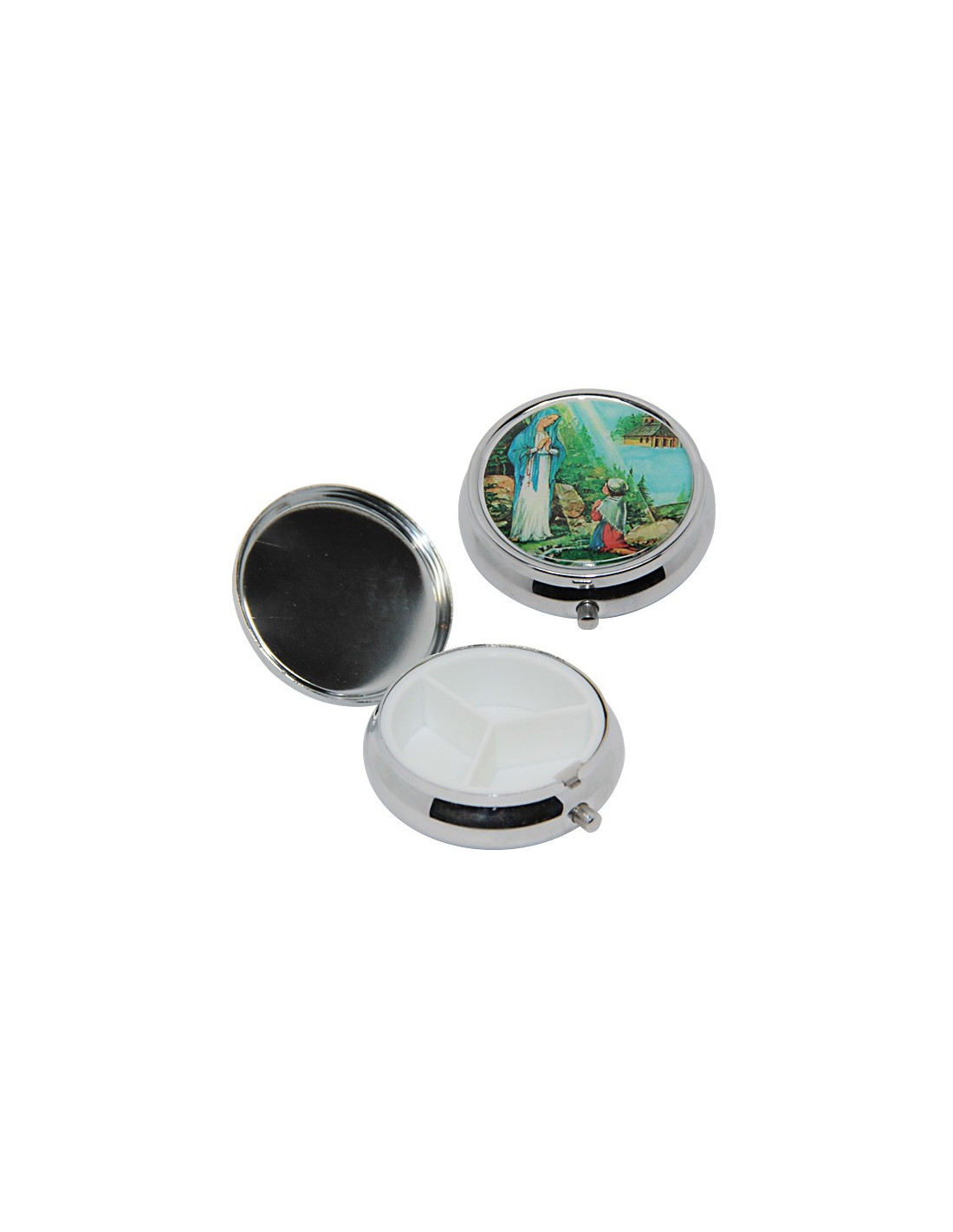 Pillendose aus Metall mit drei Aufbewahrungsfächern. Der Deckel dieser kleinen Dose ist mit dem Bild der Erscheinung der Jungfrau der Armen vor Mariette Beco, auch Erscheinung von Notre Dame de Banneux genannt, verziert.