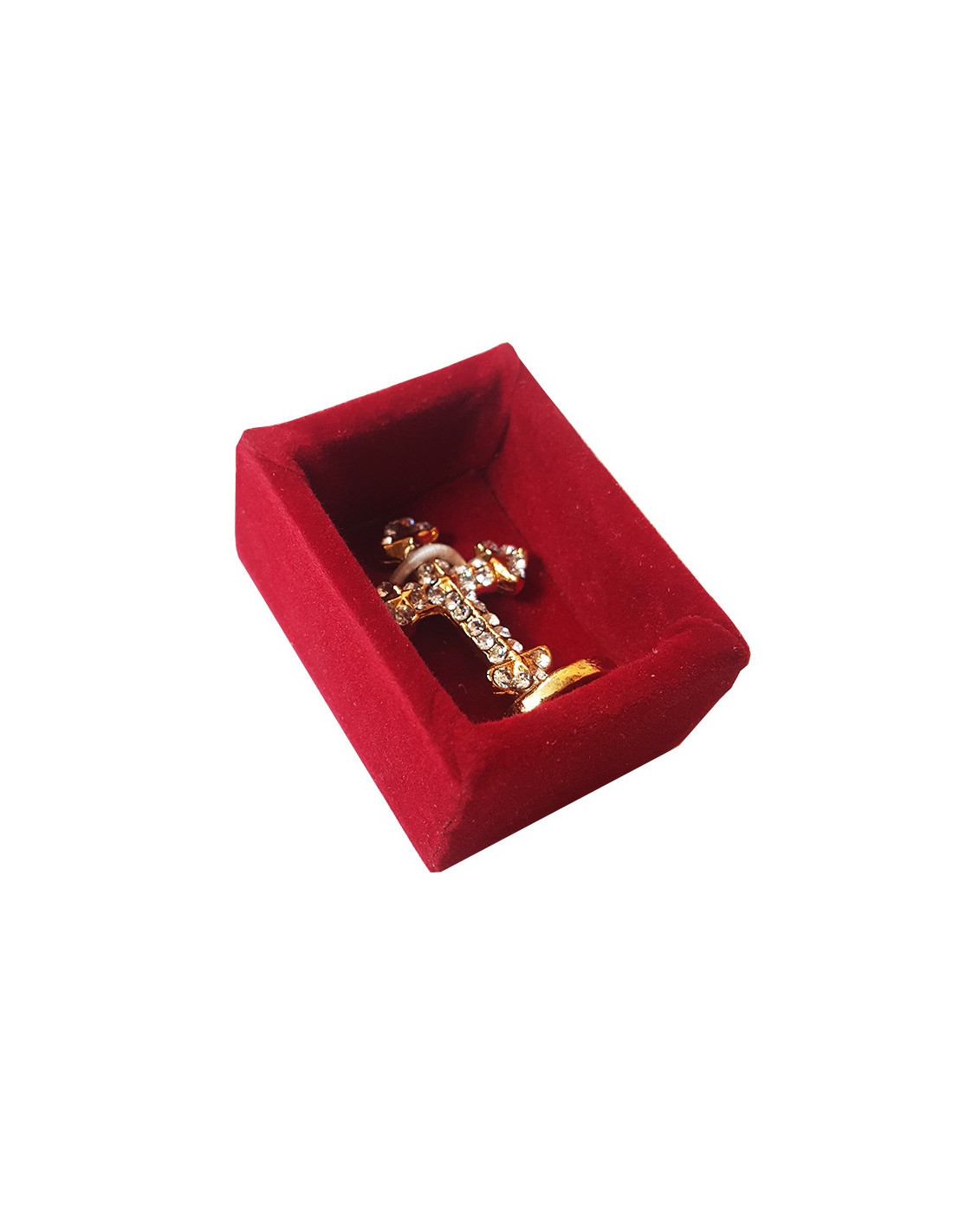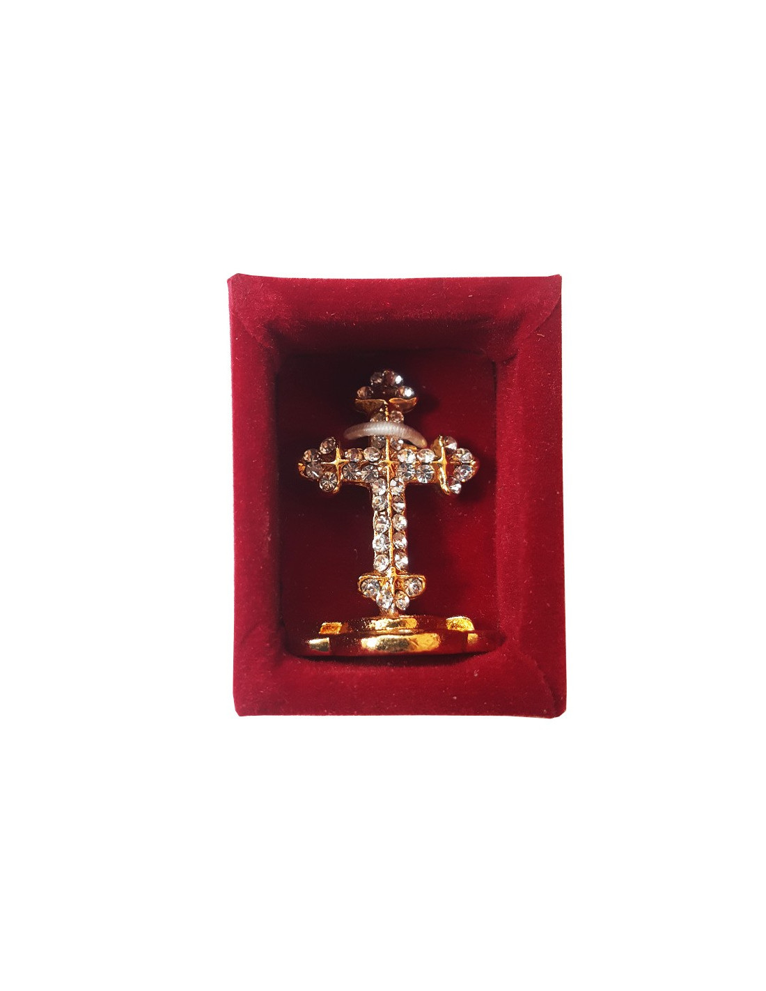 Fein geschnitztes Miniatur-Standkreuz aus vergoldetem Metall mit weißen Kristallen als Intarsien. Glänzend und leuchtend ist dieses kleine Kreuz ein Symbol des Glaubens, das überall aufgestellt oder auf Reisen, wie z. B. Pilgerfahrten, mitgenommen werden kann. In der kleinen roten Samtschachtel lässt es sich sicher transportieren. Es ist auch eine tolle Geschenkidee, um ein neues Mitglied der christlichen Gemeinschaft zu feiern, ein Kinderzimmer zu schmücken und zu segnen...