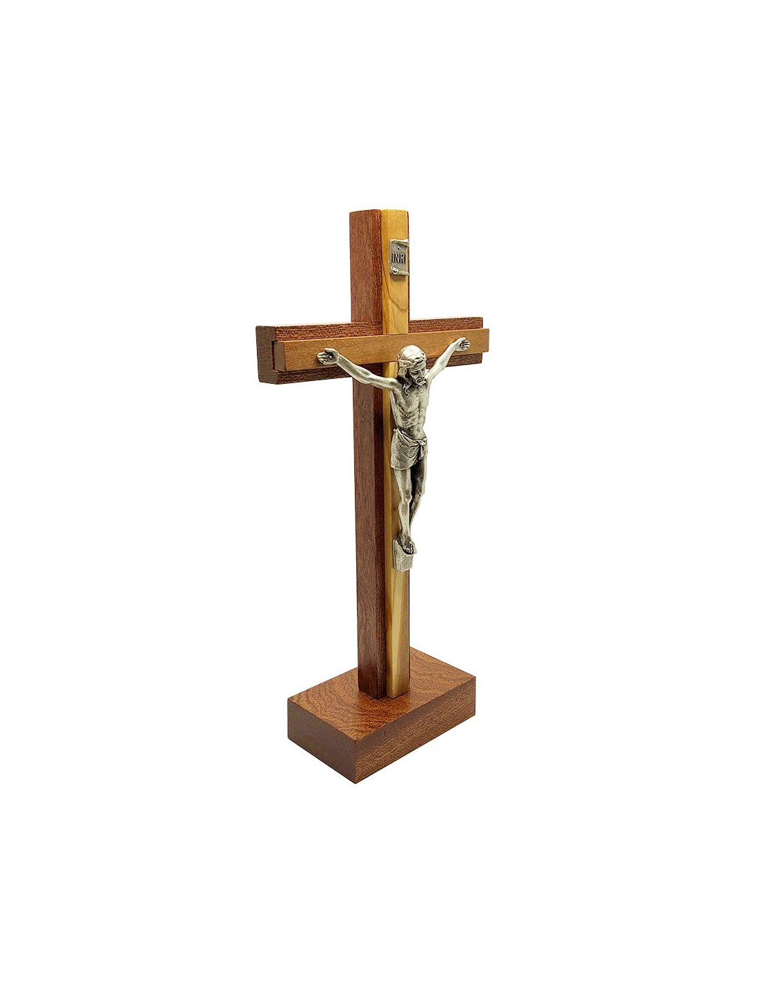 22 cm hohes Kreuz aus natürlichem Olivenholz und Mahagoni mit Sockel. Die Christusfigur ist aus versilbertem Metall. Ein kraftvolles Symbol des Glaubens.