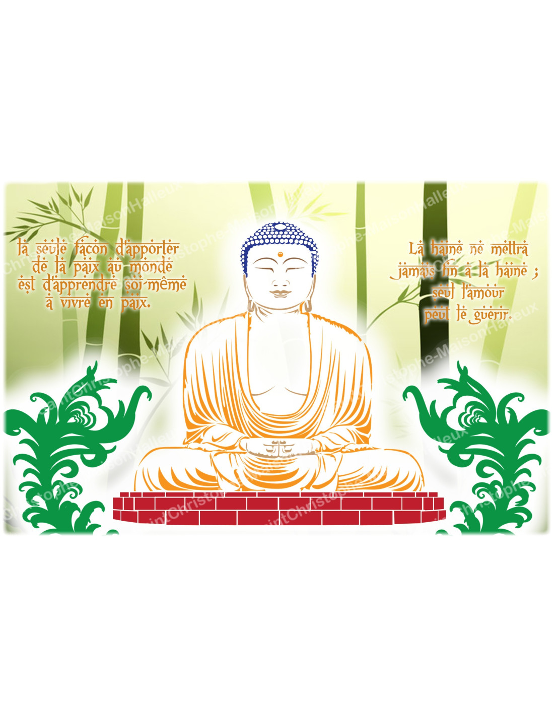 Der Aufkleber zeigt eine Illustration von Buddha vor dem Hintergrund eines Bambuswaldes mit einem Zitat über den Weltfrieden, den Frieden für sich selbst und die Liebe.