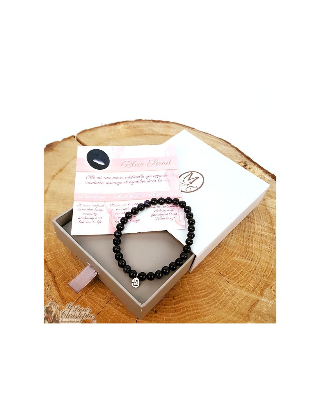 Dieses elastische Armband aus synthetischen blauen Sandsteinperlen ist eine köstliche und geheimnisvolle Note, die man am Handgelenk tragen kann.