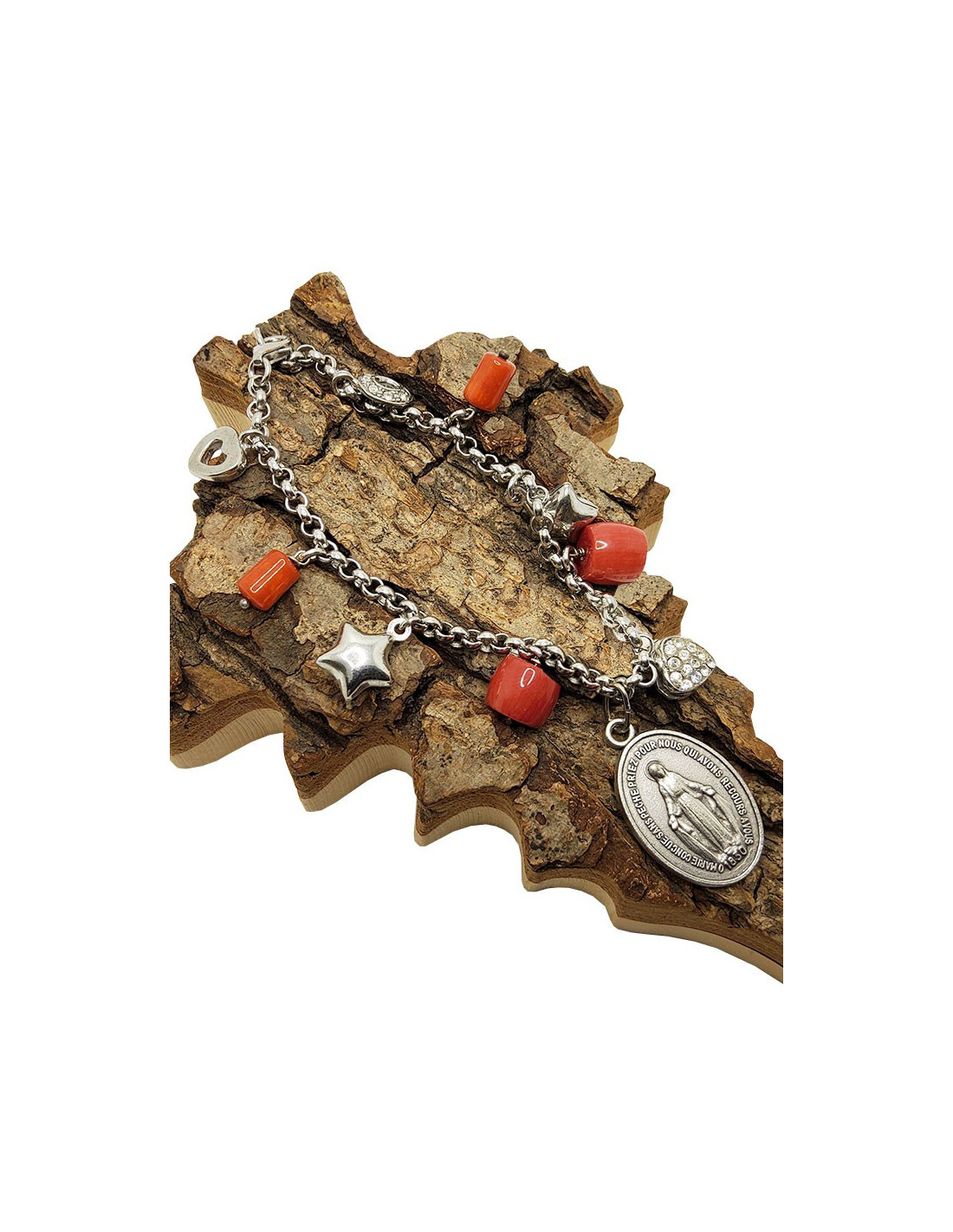 Armband aus 925er Silber mit einer Medaille der Wundertätigen Jungfrau, Anhängern aus rotem Jaspis und kleinen Verzierungen.
