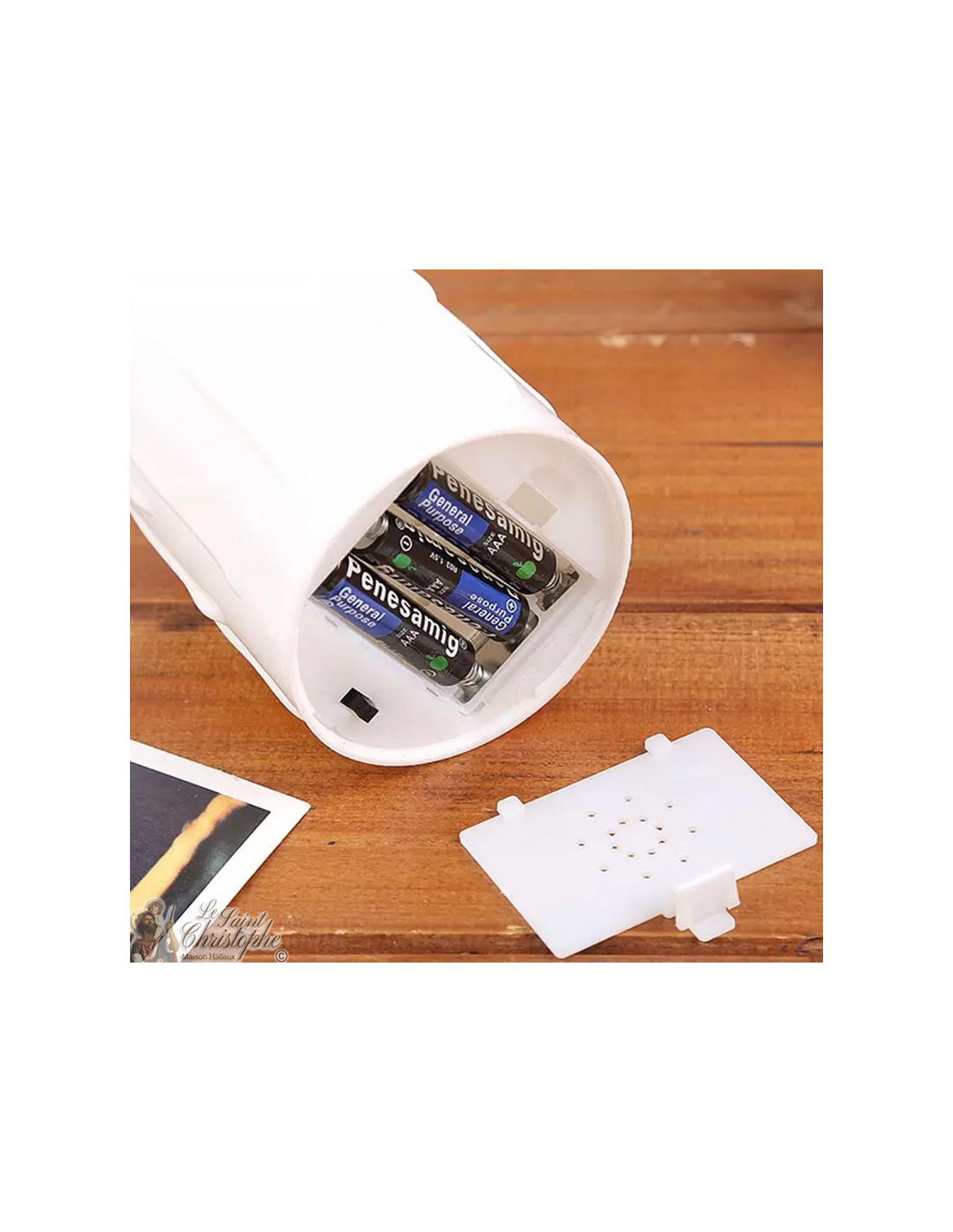 LED-Kerze aus Kunststoff, die, einmal angezündet, dank eines beweglichen Schirmmechanismus einen echten Kerzenflammeneffekt erzeugt.