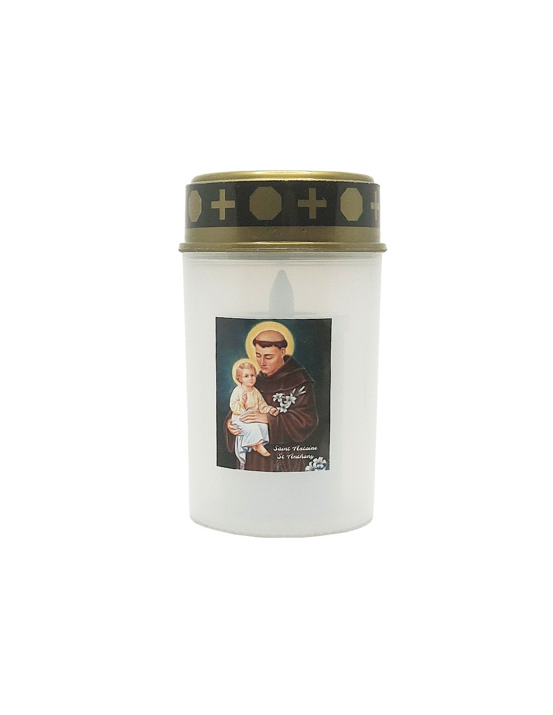 Diese LED-Kerze ist mit dem Bild des Heiligen Antonius verziert, dem Schutzpatron der Seefahrer und Schiffbrüchigen, der Armen und Unterdrückten, der Schwangeren, der Hungernden und der Reiter. Es wird empfohlen, ihn für unfruchtbare Menschen zu beten, die sich ein Kind wünschen, um verlorene Gegenstände oder Personen wiederzufinden oder um vergessene Dinge zu finden.