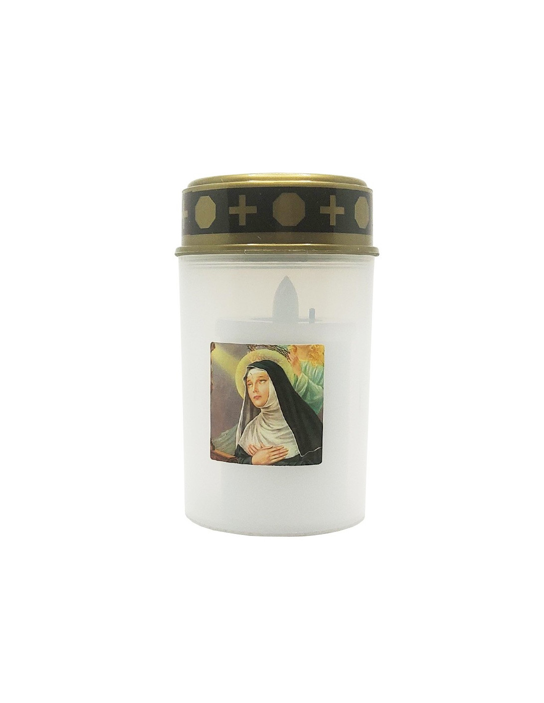 Diese LED-Kerze ist mit dem Bild der Heiligen Rita von Cascia verziert, der Schutzpatronin der verzweifelten und unmöglichen Fälle, der Eheprobleme, der schlecht verheirateten Frauen oder der Opfer von Missbrauch. Sie wird für ihre Hingabe, ihre Geduld und die von ihr vollbrachten Heilungswunder verehrt.
