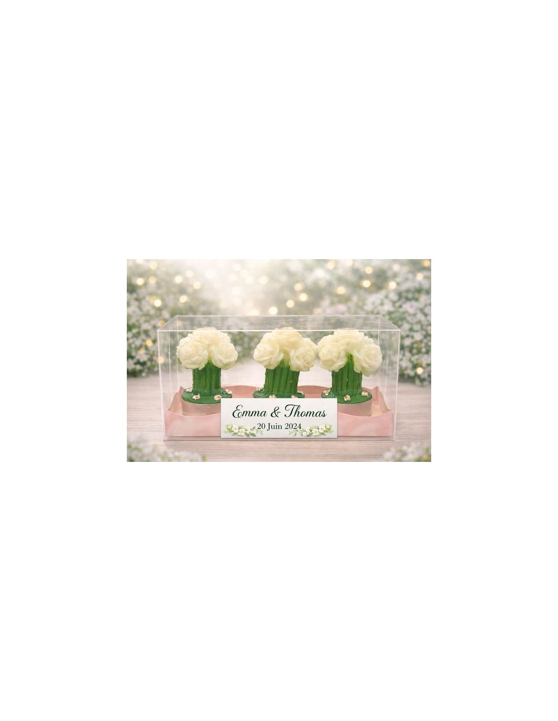 Verleihen Sie Ihren Veranstaltungen Eleganz und Emotion mit dieser wunderschönen Kerze in Form eines Straußes weißer Rosen, die ganz nach Ihren Wünschen personalisiert werden kann.