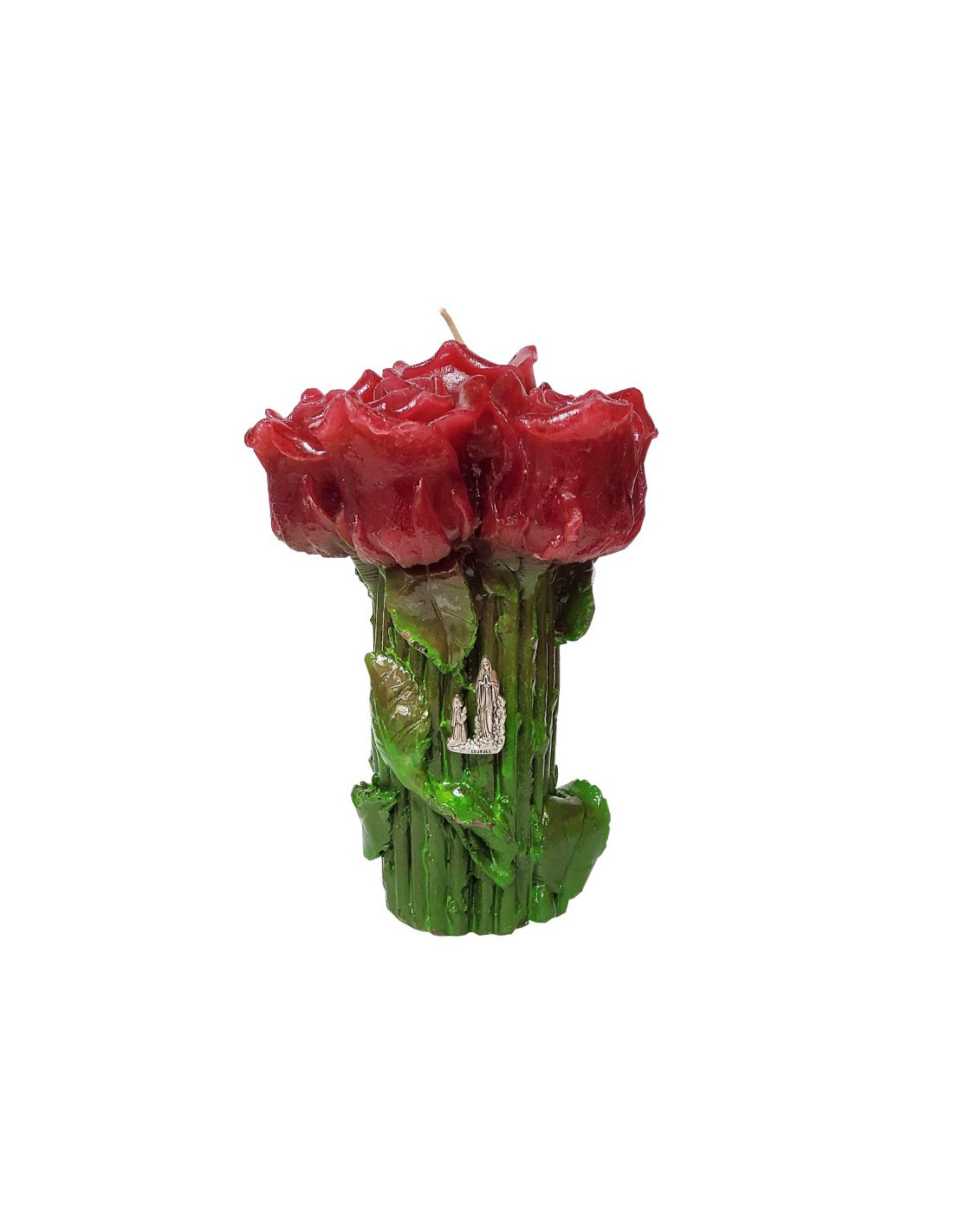 Kerze mit roten Rosenblüten und Lourdes-Erscheinungsnadeln