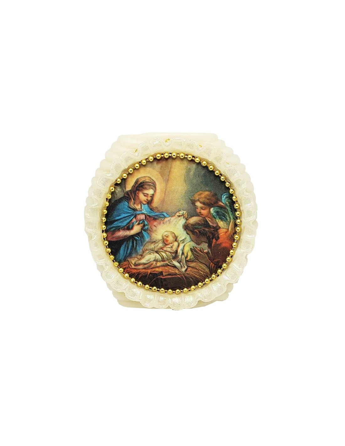 Dekorative Novene-Kerze, eine einzigartige Wachsanfertigung mit einer Illustration der Geburt Jesu Christi. Das Wachs bildet ein zartes, perlmuttfarbenes Tuch um das Bild von Jesus als Baby, das von Engeln und Maria umgeben ist. Einige Teile sind mit Goldfarbe bemalt, um die Farben der Illustration hervorzuheben. Die Malerei ist rundherum mit goldenen Perlen verziert. Dies ist eine schöne Geschenkidee für eine Taufe oder Geburt.