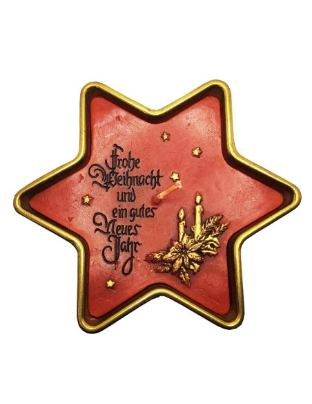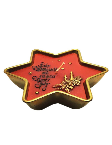 Diese handgefertigte Kerze ist ideal für Weihnachtsfeiern und wird in einer schönen sternförmigen Messingschale gegossen. Das Wachs ist graviert, geschnitzt und bemalt mit dem kalligraphischen Satz „Frohe Weihnachten und ein gutes neues Jahr“ auf Deutsch und einer Blumendekoration mit brennenden Kerzen.