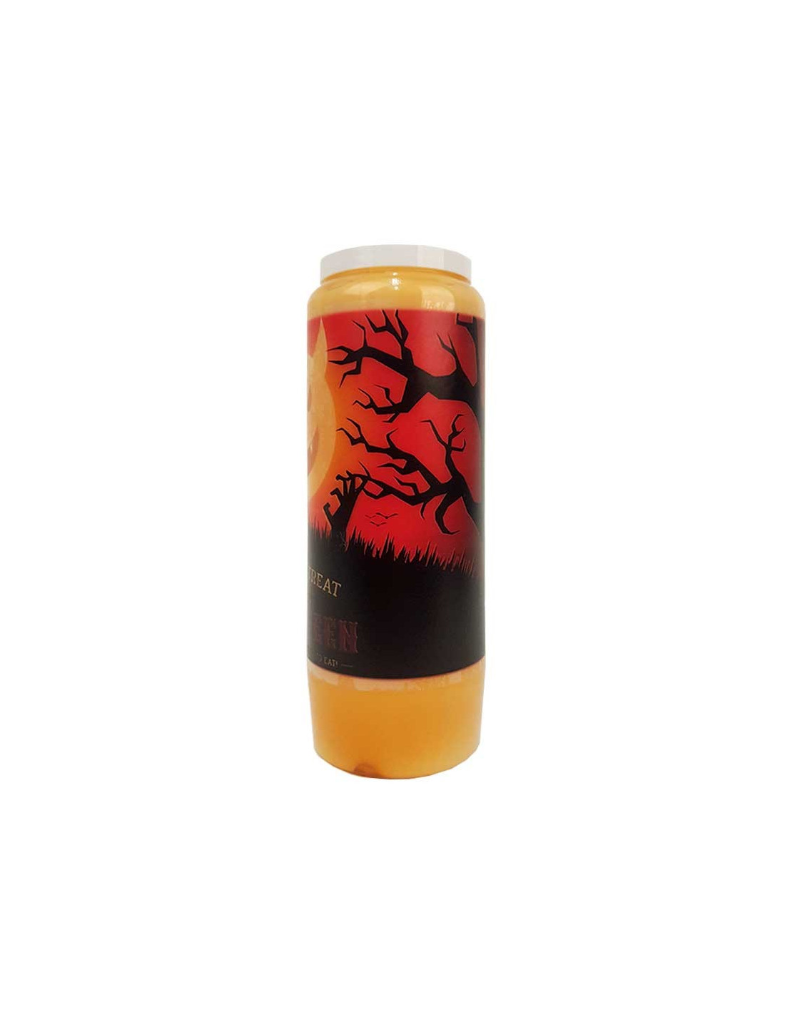 Nach Orangen und Zimt duftende Novenakerzen mit einer speziellen Halloween-Illustration. Das Bild ist transparent für einen Photophoreffekt.