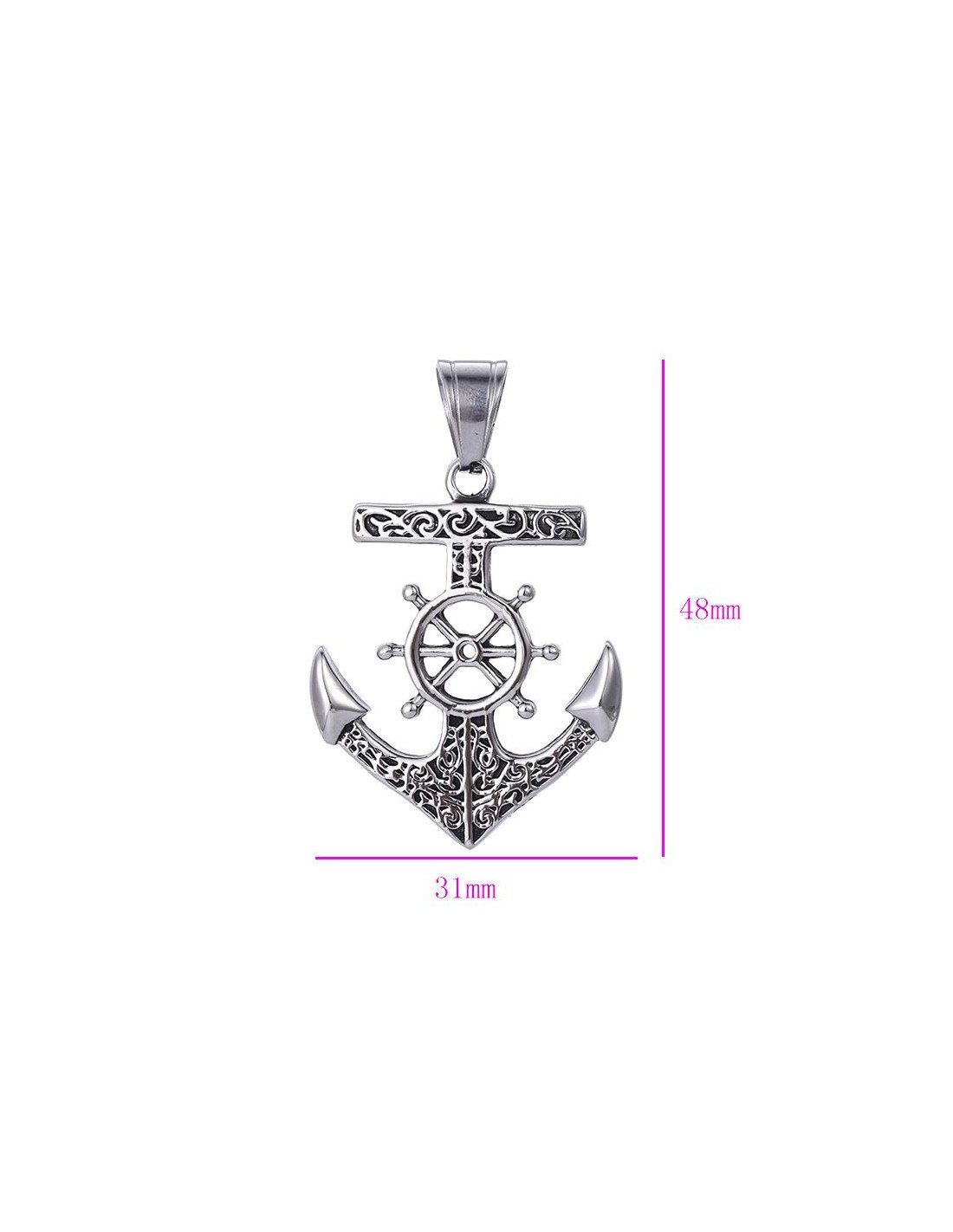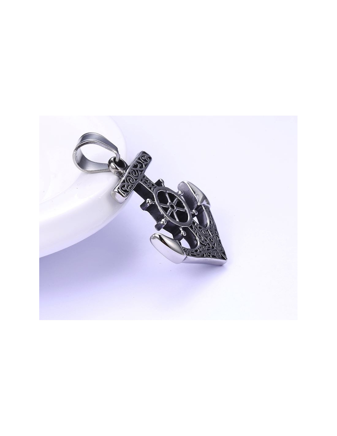 Dieser Edelstahl-Anhänger ist perfekt, um zum Reisen einzuladen! In Form eines Schiffsankers, gekoppelt mit einem Ruder, ist dieses Schmuckstück mit Arabesken verziert. Die wenigen Spuren von schwarzem Lack heben die Muster hervor.