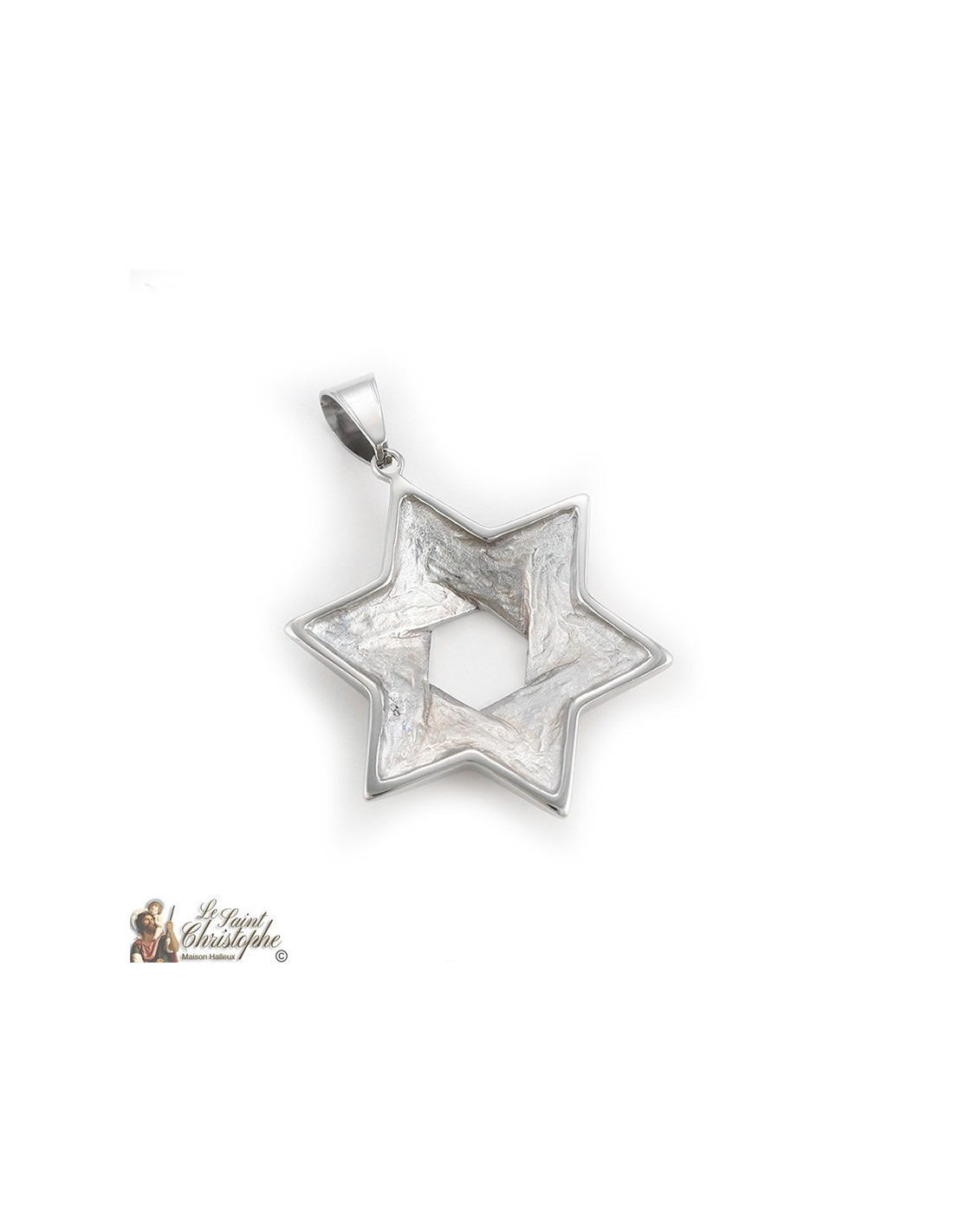 Edelstahl-Anhänger in Form eines Davidsterns, auch bekannt als Siegel Salomons. Dieser Stern ist doppelt, einer in Umrissen und der andere mit verschlungenen Linien, die dem Anhänger ein Relief und ein zartes Aussehen verleihen.