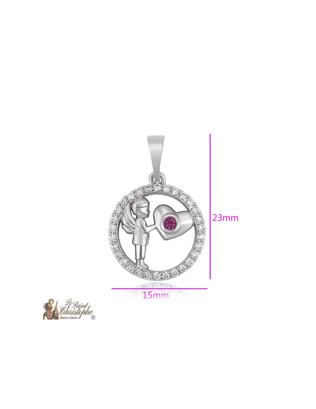 Anhänger aus rostfreiem Stahl. Es stellt einen kleinen geflügelten Jungen oder einen kleinen Engel dar, der ein mit einem rosa Kristall besetztes Herz hält und von einem mit mehreren weißen Kristallen besetzten Ring umgeben ist. Sein silbriger Aspekt ist ein echtes kleines Licht, das das Dekolleté erhellt!