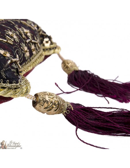Die tief bordeauxrote Farbe, kombiniert mit goldenen Stickereien und dem schlafenden Engel mit goldenen Flügeln, macht dieses dekorative Stück zu einem warmen, raffinierten und symbolträchtigen Objekt voller Frieden und Schutz.