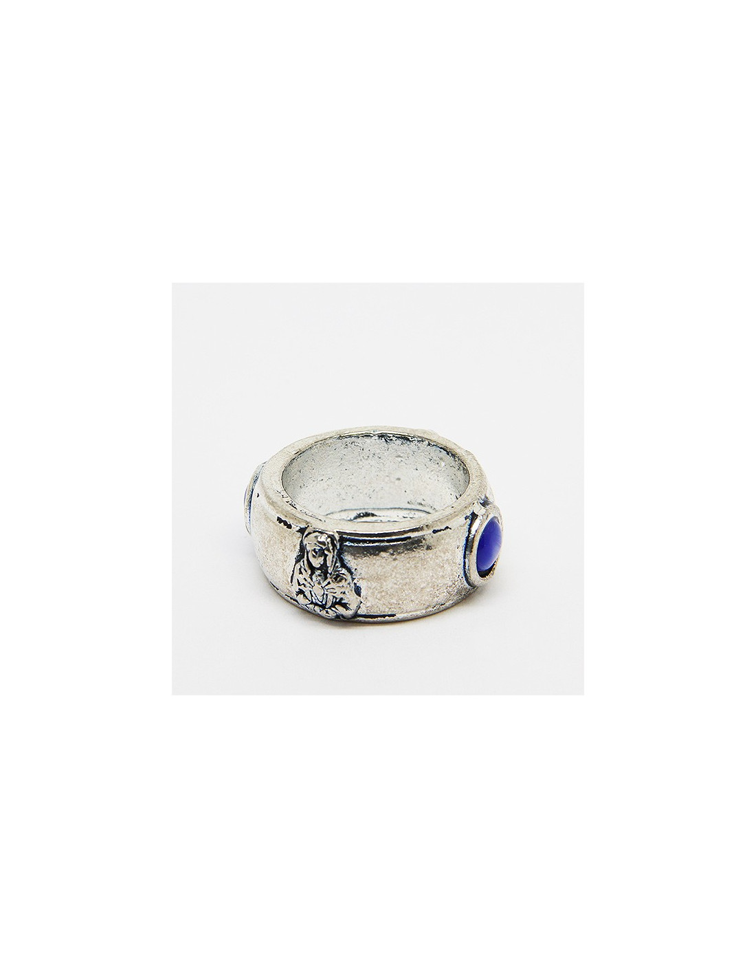 Dieser Ring aus massivem Silbermetall zeigt das Heiligste Herz Jesu und die Muttergottes der sieben Schmerzen. Das Heiligste Herz Jesu ist ein Symbol für große Güte und Unsere Liebe Frau von den sieben Schmerzen für Mitgefühl und Selbstlosigkeit. Auf beiden Seiten des Rings sind zusätzlich zu den Figuren farbige Glasperlen angebracht.