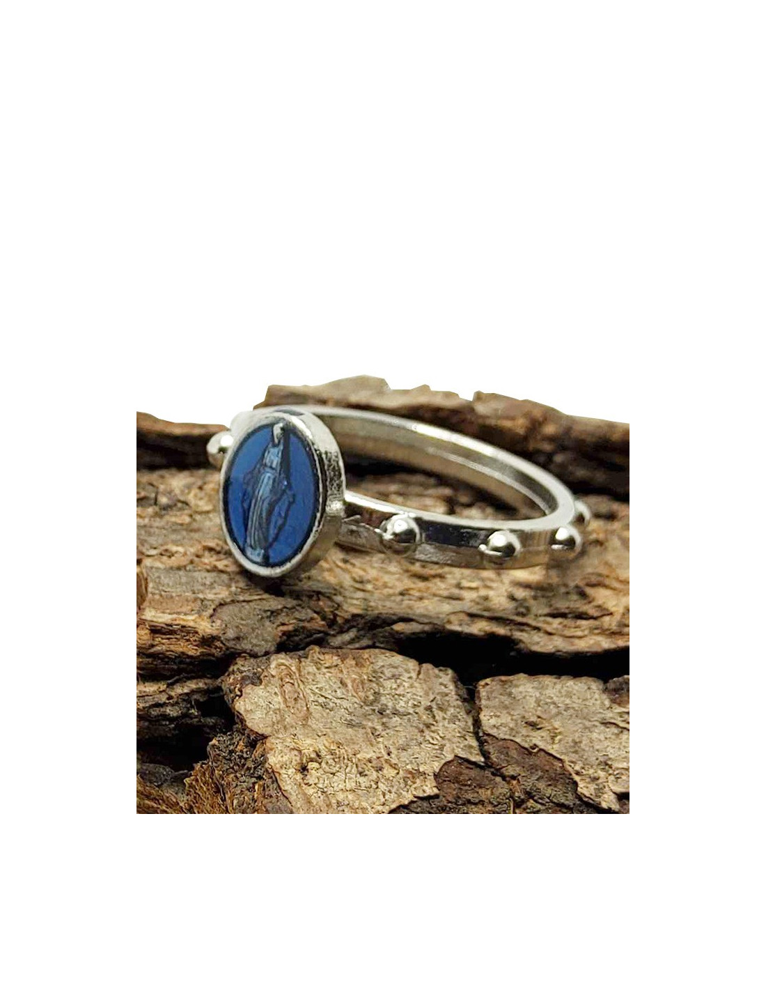 Rosenkranzring aus versilbertem Modeschmuck mit einer Medaille der Wunderbaren Jungfrau, die mit dunkelblauem, transparentem Emaille überzogen ist. Dieses tiefe Blau bringt die Reliefs der Medaille zart zur Geltung. Rosenkranzringe zeichnen sich dadurch aus, dass sie rund um den Ring kleine Kugeln haben, die als tragbarer Rosenkranz dienen, ein Rosenkranz mit zehn Perlen, den man als elegantes Gebetswerkzeug bei sich tragen kann.