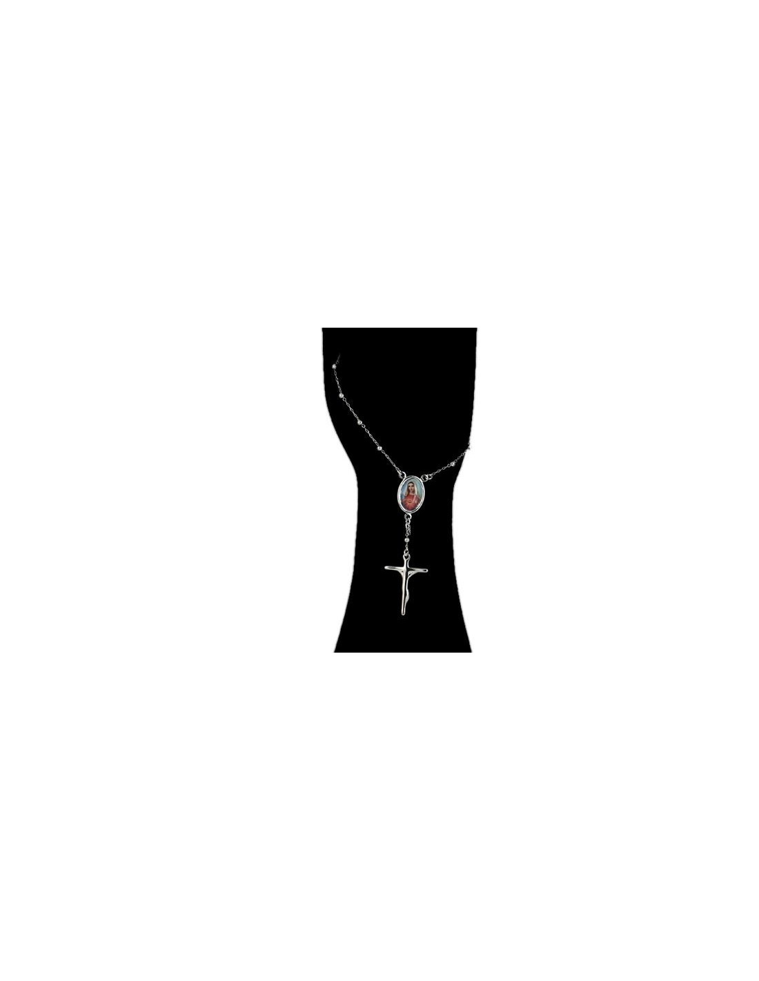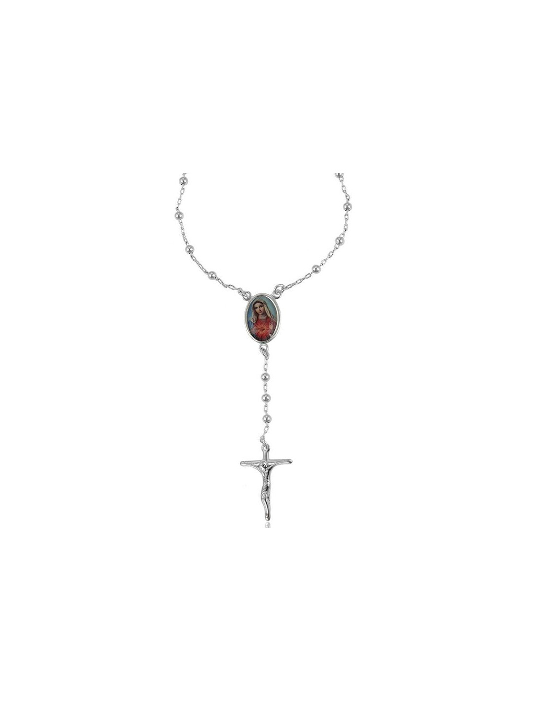 Dieses Armband aus versilbertem Metall ist fein und zart. Es ist mit einer Medaille mit dem Bildnis des Heiligsten Herzens Mariens, einem Symbol der bedingungslosen Liebe, und dem christlichen Kreuz mit der Figur von Jesus Christus geschmückt. Durch die kleinen Punkte, die auf dem Armband verstreut sind, können Sie es als Zehner verwenden und Ihre Gebete jederzeit begleiten.