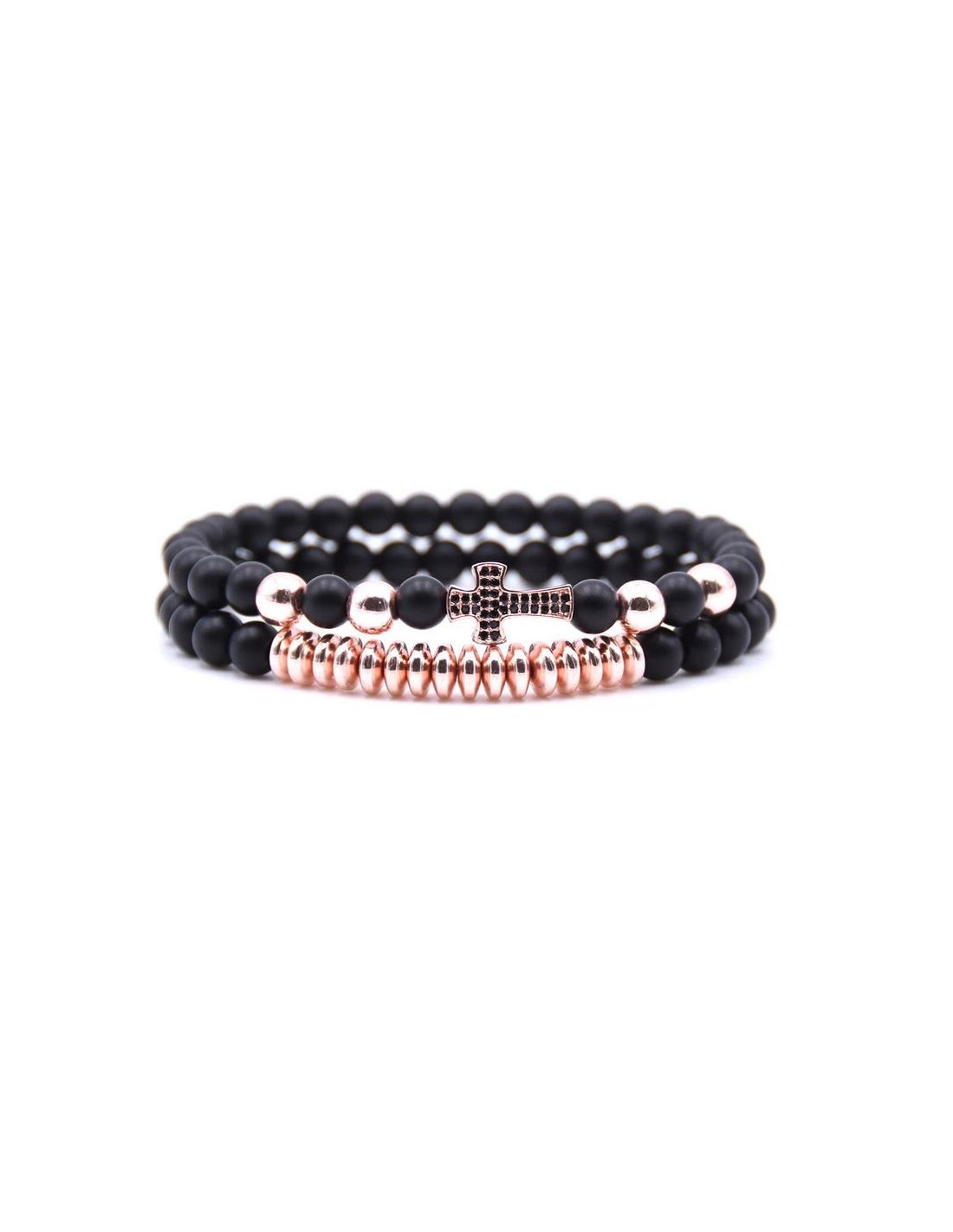 Ein Armband ist gut. Ein passendes Paar ist noch besser! Diese werden aus mattschwarzen Perlen und glänzenden Kupferperlen hergestellt. Diese Berührungen mit goldenen und rosafarbenen Reflexen verleihen diesem Set den ganzen Chic. Den letzten Schliff gibt der kreuzförmige Charme, ebenfalls kupferfarben und mit schwarzen Kristallen besetzt.