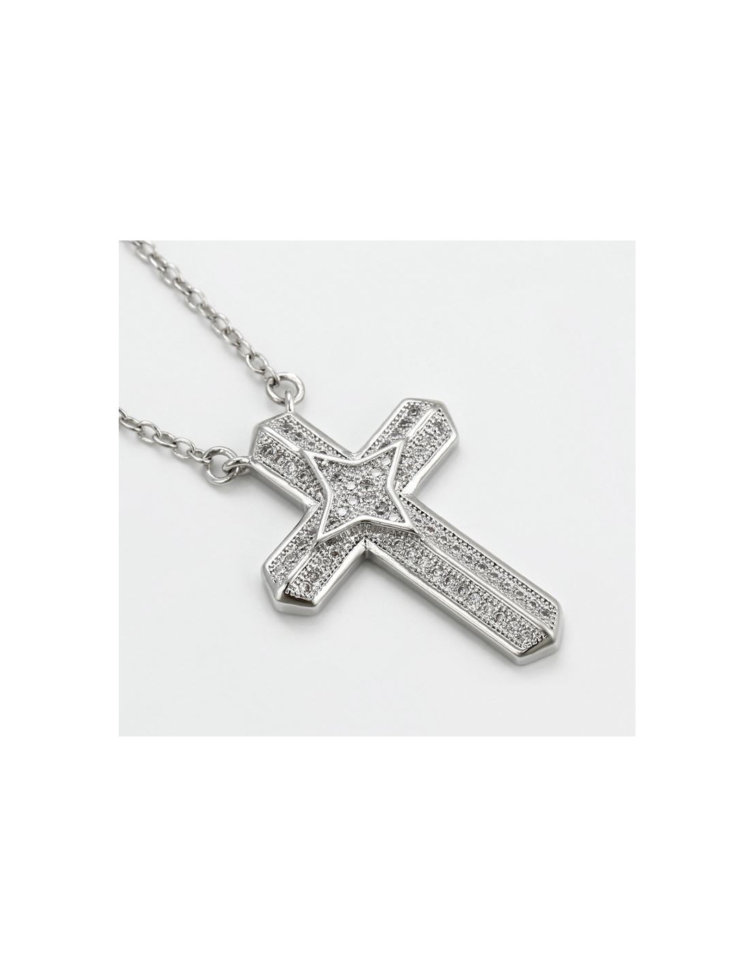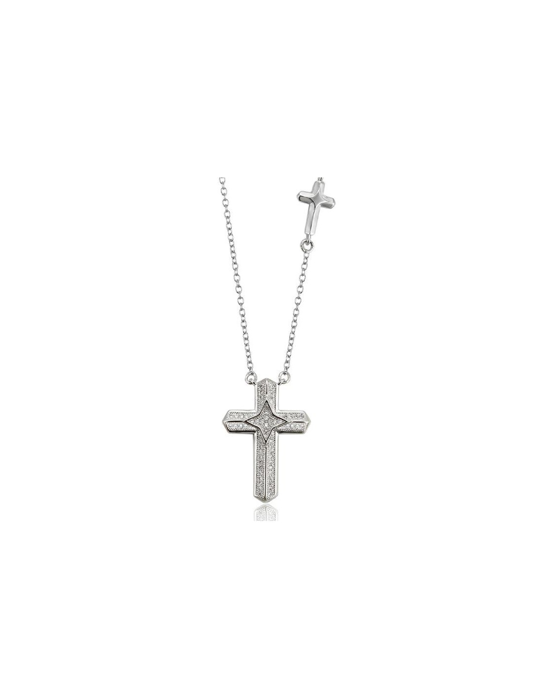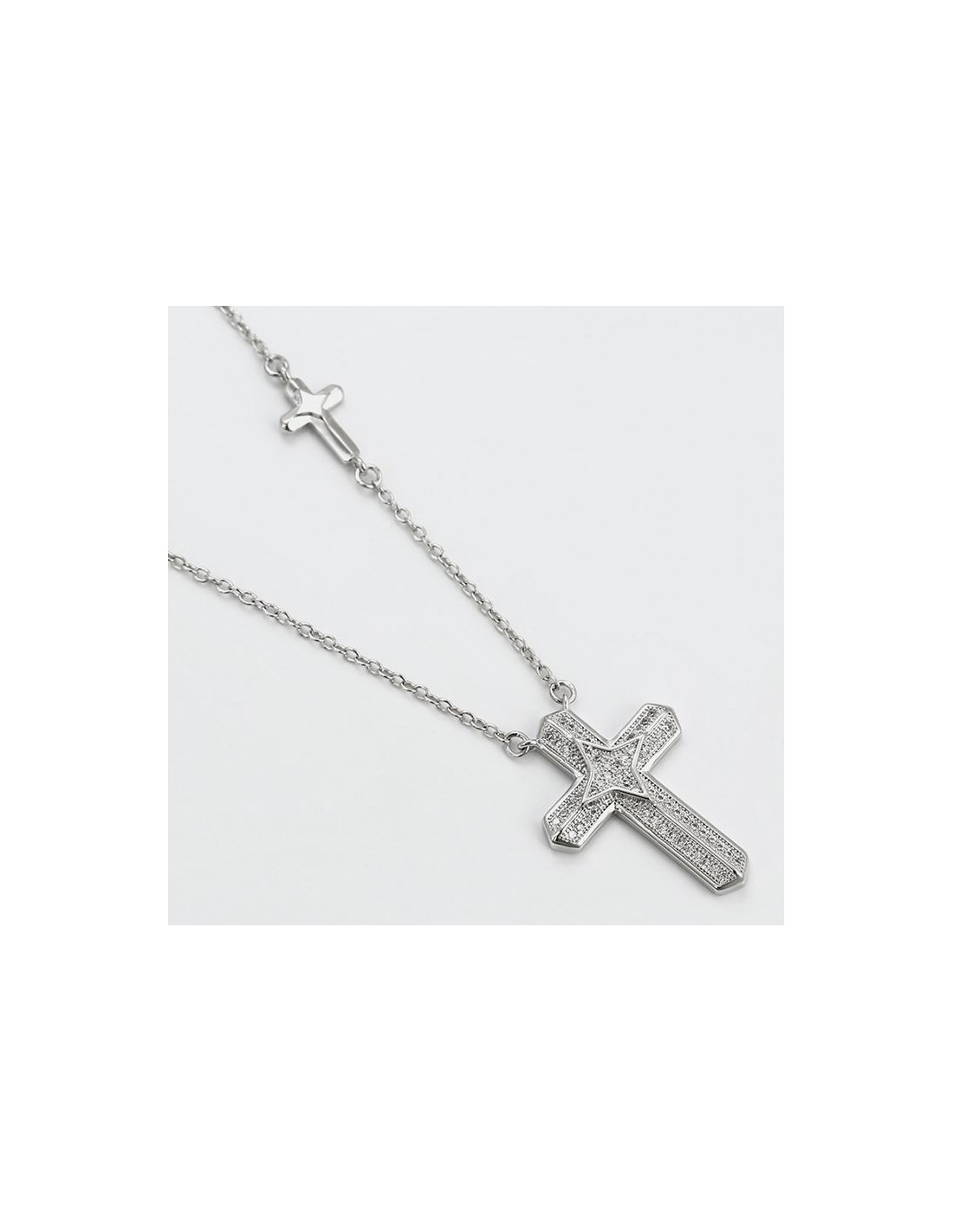 Halskette aus Kupfer-Rhodium, Silbermetall-Optik, mit zwei Rhodium-Anhängern. Bei den Anhängern handelt es sich um zwei Kreuze, das kleine ist in die Kette integriert, das große ist als Hauptanhänger aufgehängt. Letztere ist mit synthetischen CZ (Swarovski)-Kristallen eingelegt.