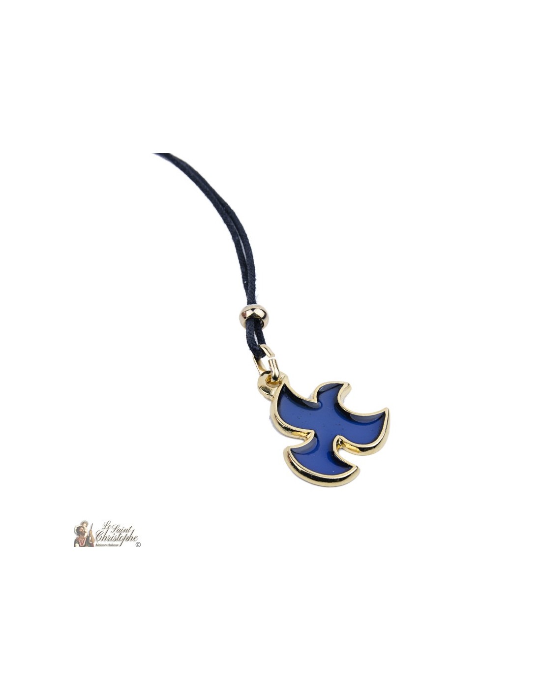 Halskette mit Kordel und Taubenanhänger. Die Halskette ist eine schwarze Lederkordel, die mit zwei goldenen Perlen verziert ist. Der Anhänger ist eine stilisierte Taube aus transparentem, königsblauem Harz, die mit einer Umrandung aus goldfarbenem Metall veredelt ist. Ein elegantes Schmuckstück, das den christlichen Glauben, den Frieden und den Heiligen Geist symbolisiert. Es ist ein ideales Geschenk zur Kommunion oder zur Hochzeit.