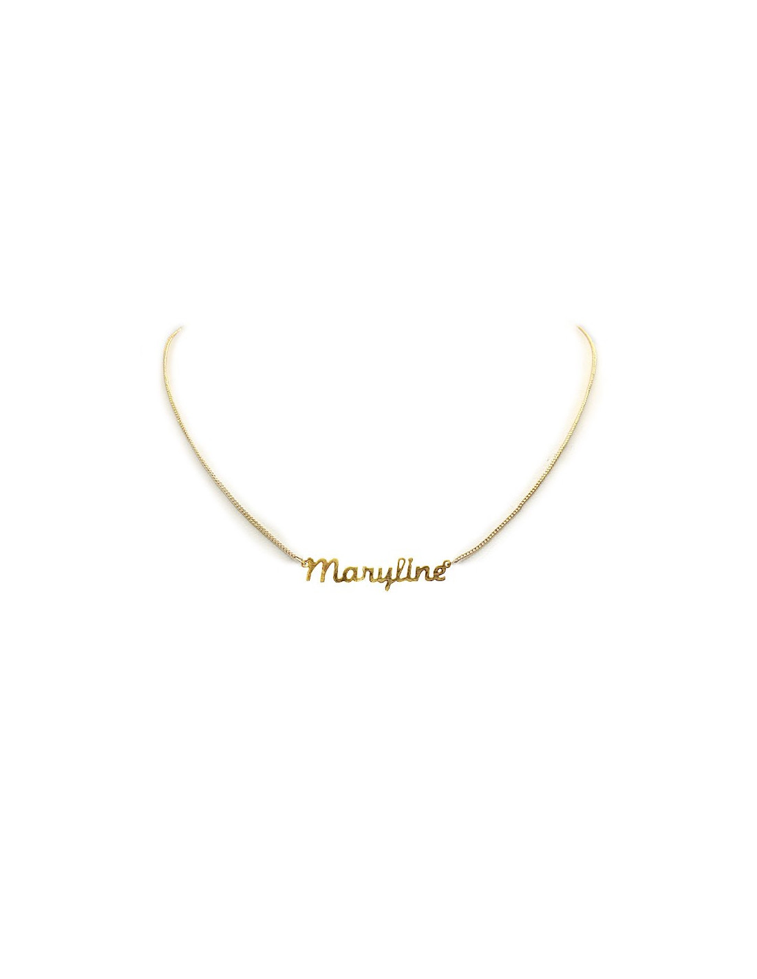 Zeigen Sie Ihren Vornamen oder den eines geliebten Menschen mit dieser vergoldeten Halskette. Der Name „Maryline“ in schönen vergoldeten Buchstaben ist an einer vergoldeten Metallkette befestigt. Sie setzt sich aus den Vornamen Marie, deren hebräische Wurzel „lieb“ oder „geliebt“ bedeutet, und Line, die entweder mit einem germanischen Begriff für „edel“ oder einem arabischen für „Süße“ verknüpft werden kann, zusammen. Dieses edle Schmuckstück ist eine liebevolle Geschenkidee, perfekt zum Geburtstag, Jahrestag oder einem besonderen Anlass.