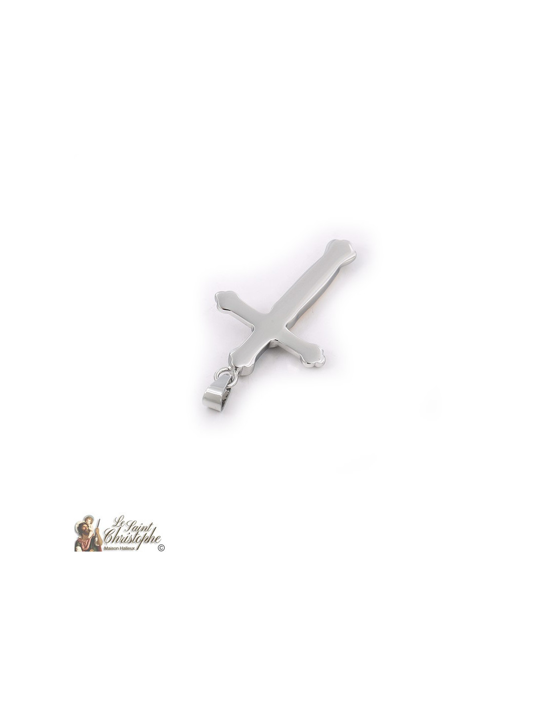 Edelstahl-Anhänger in Form eines silbernen Kreuzes mit einer Goldfeder an der Spitze. Das Kreuz ist mit einigen schwarzen Emaillen verziert, um einen besseren Kontrast zur fein gearbeiteten Feder zu erzielen.