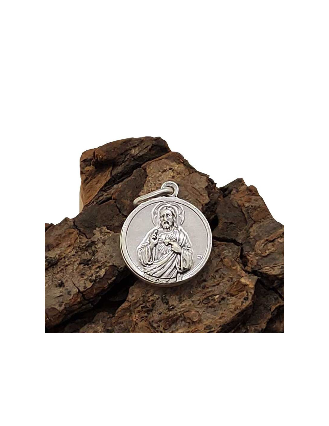 Religiöse Medaille des Heiligsten Herzens Jesu und Unserer Lieben Frau vom Berge Karmel am Skapulier. Dieser Fantasieanhänger aus versilbertem Metall ist garantiert nickelfrei, um Allergierisiken zu vermeiden. Die Medaille ist rund und zeigt auf der einen Seite das Heiligste Herz Jesu und auf der anderen Seite Unsere Liebe Frau vom Berge Karmel.