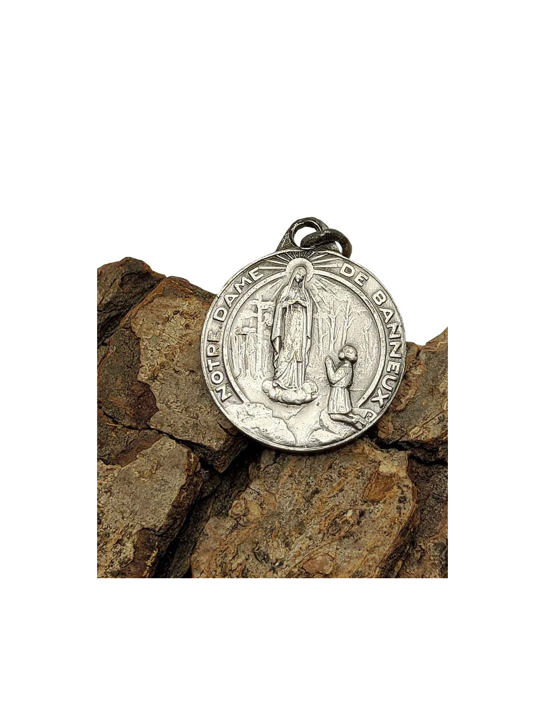 Runde Medaille auf die Heilige Jungfrau, das sanfte und beruhigende Porträt mit einer Aura aus Licht. Phantasiemedaille aus silbergrauem Metall. Sie ist ein hübsches Andenken an diesen heiligen Ort mit dem von der Kirche anerkannten Wunder. Die Rückseite illustriert die Erscheinung der Jungfrau der Armen, wie sie von Mariette Béco gesehen wurde, die an 8 Erscheinungen teilgenommen hatte.