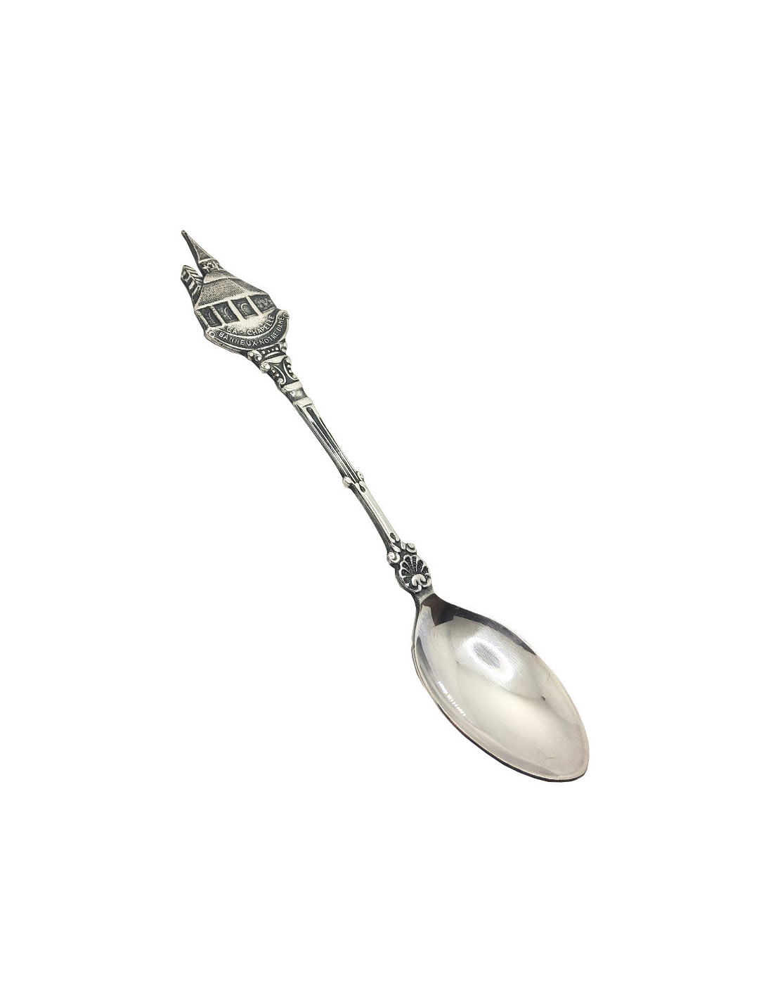 Die Oberseite des Löffels zeigt eine feine Darstellung der Kapelle, während der Stiel mit eleganten, abgerundeten Motiven verziert ist, darunter eine Art Muschel.