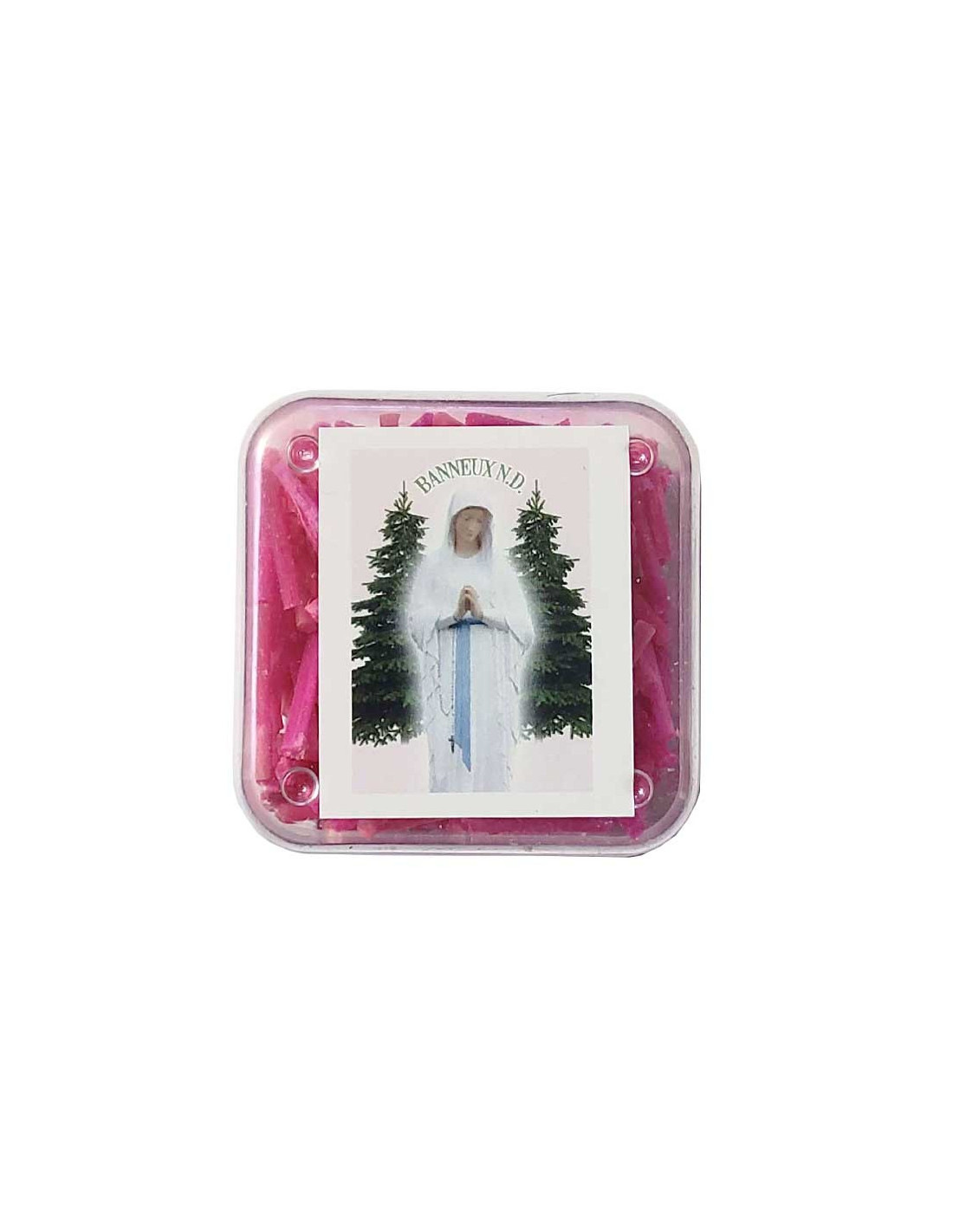 Schachtel mit ca. 200 Öllampendochten. Die Schachtel ist mit einem Bild der Jungfrau der Armen aus Notre Dame de Banneux verziert und enthält einen Clip und einen Korkschwimmer.