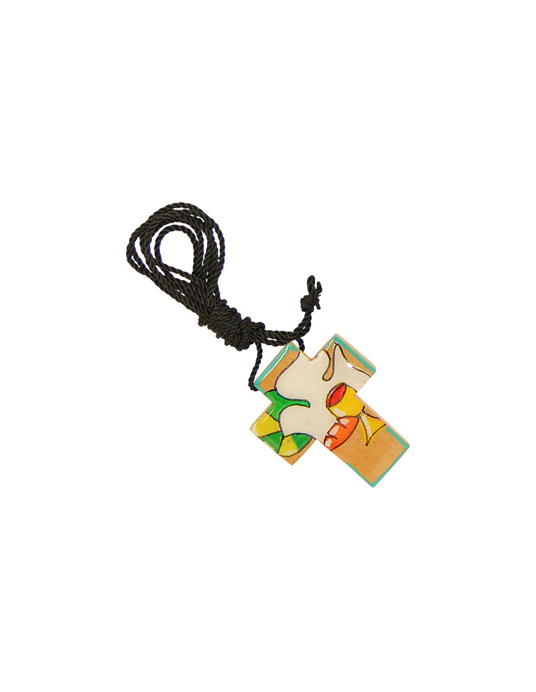 Von mexikanischen Kunsthandwerkern handgeschnitztes und handbemaltes Holzkreuz zugunsten christlicher Kongregationen in Mexiko, um ihre Kirche zu unterhalten und bedürftigen Menschen zu helfen. Es ist ein schlichtes Schmuckstück in leuchtenden Farben, das christlichen Glauben, Nächstenliebe und handwerkliche Originalität vereint. Dieser Anhänger mit Kordel eignet sich hervorragend als Erinnerungsgeschenk für eine Kommunion.