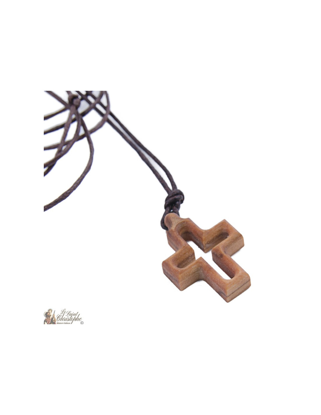 Halskette mit Kordel und Anhänger aus Olivenholz. Der Anhänger hat die Form eines Kreuzes mit eckigen Außenrändern und abgerundeten Innenwänden, wodurch ein Kreuzeffekt im Inneren des Kreuzes entsteht.