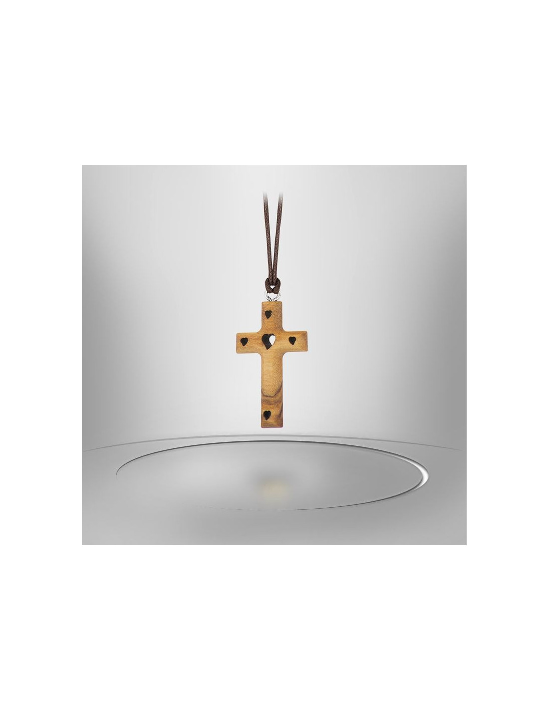 Kordelhalskette mit Anhänger aus Olivenholz. Der Anhänger ist ein dünnes, an mehreren Stellen geschnitztes Holzkreuz mit kleinen Herzen, deren Innenkanten schwarz bemalt sind.