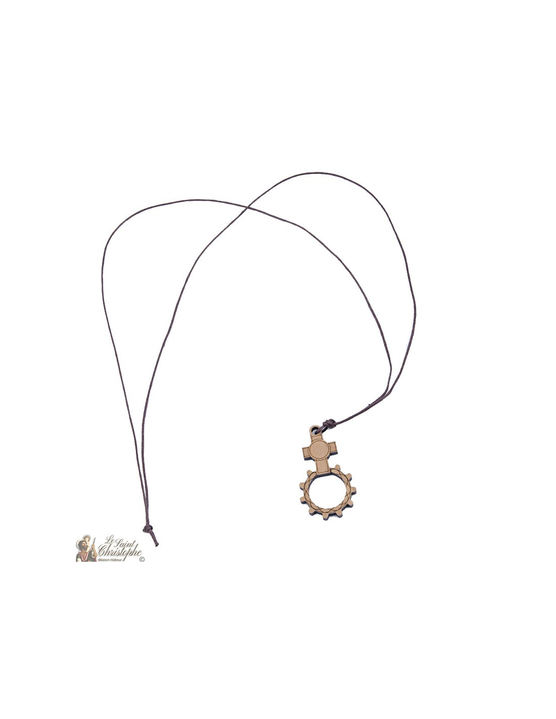 Halskette mit verstellbarer Kordel und einem Zehner-Rosenkranz aus natürlichem Holz. Der Anhänger ist ein Kreis, der von einem breiten Kreuz überragt wird. Der Kreis ist gezackt, sodass er alsZehner-Rosenkranzkette verwendet werden kann.