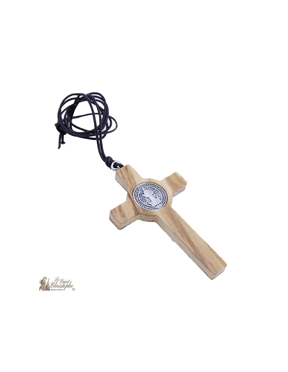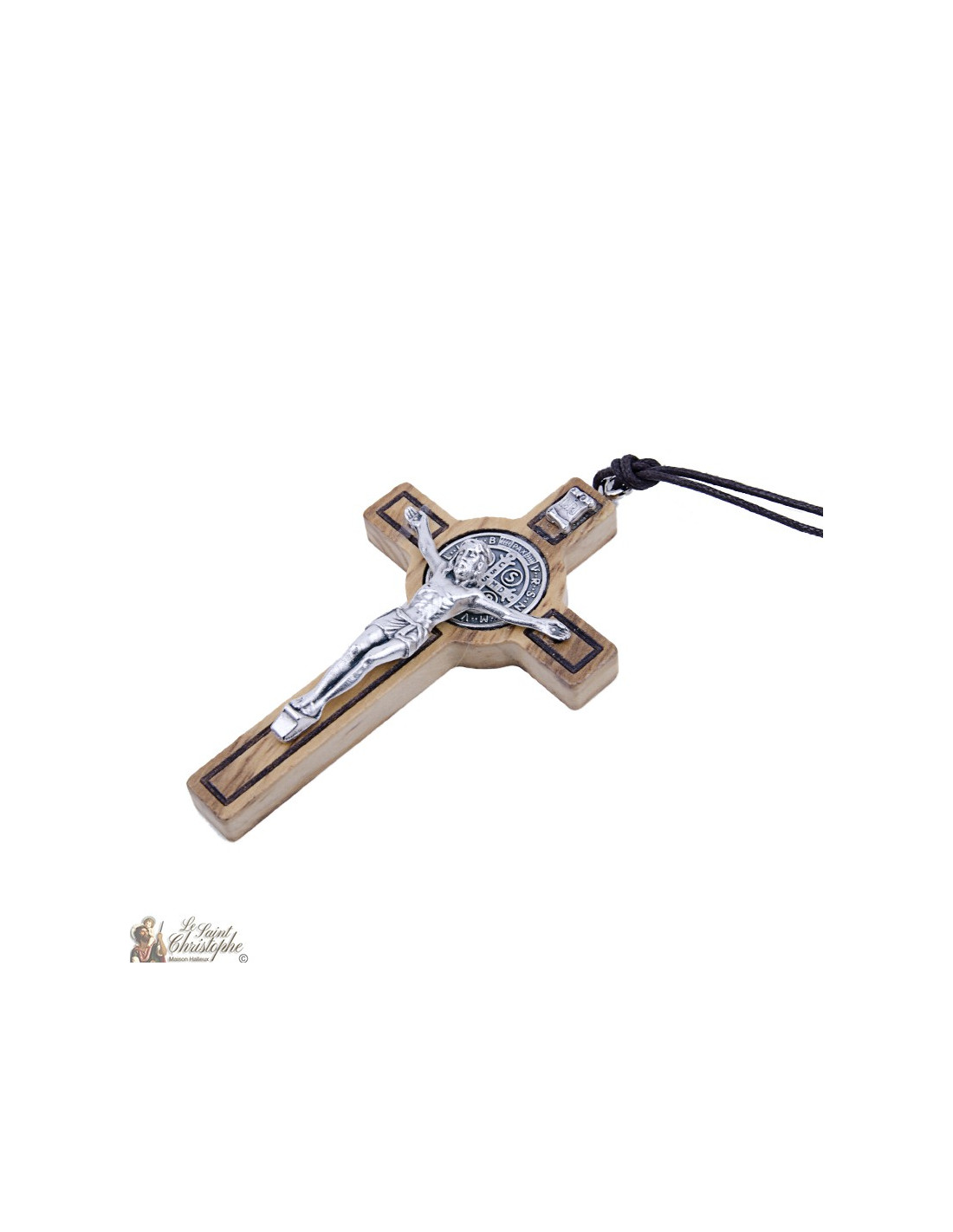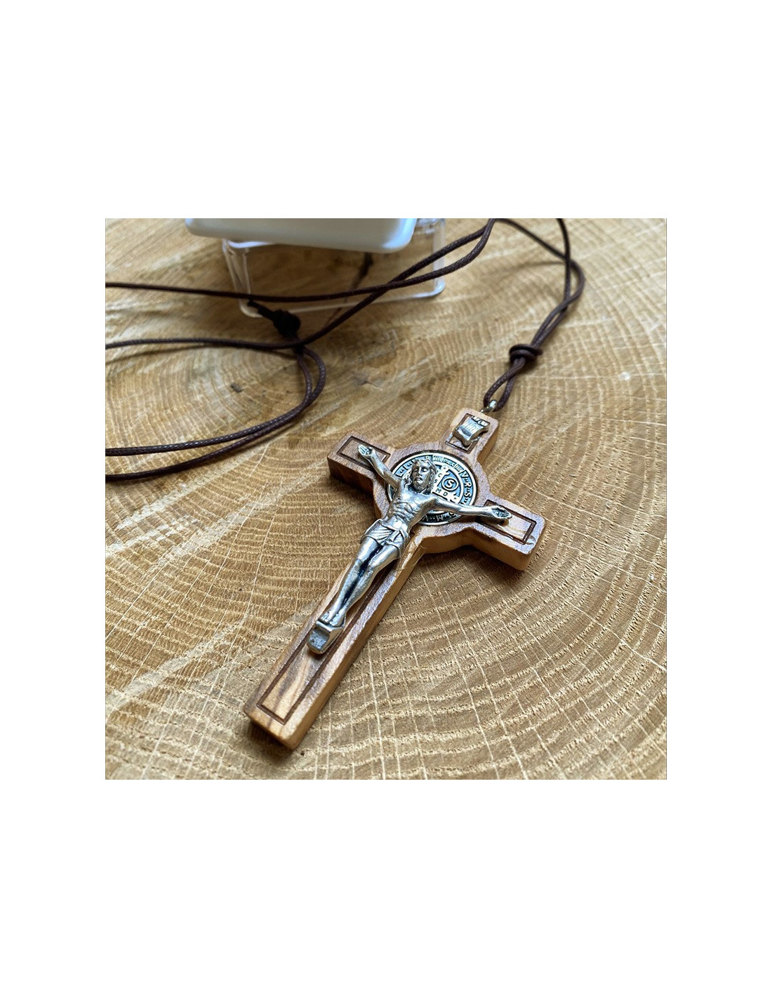 Diese Halskette aus geflochtener Kordel ist mit einem Olivenholzanhänger in Form des Kreuzes des Heiligen Benedikt versehen. Dieses Kreuz hat die Besonderheit, dass sich hinter dem Kopf Christi eine Medaille des Heiligen Benedikt befindet, ein sehr starkes Symbol für Schutz und Heilung. Die Metallteile sind versilbert: die Christusfigur, die Medaille und die INRI-Schriftrolle. Das Olivenholz ist leicht gefärbt, um die Formen des Kreuzes hervorzuheben.