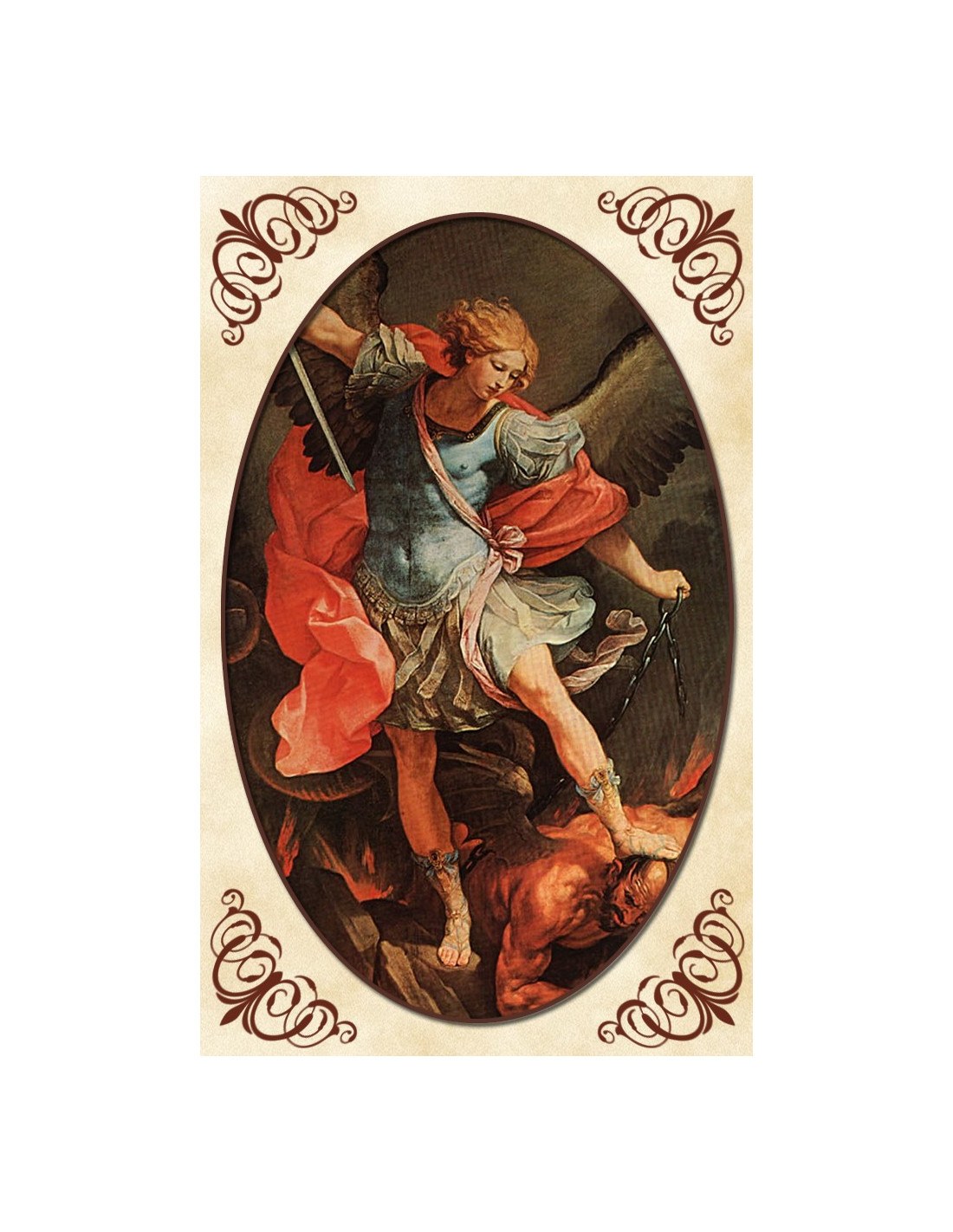 Diese Medaillenkarte ehrt den Erzengel Michael. Die laminierte Karte, die in jede Tasche oder Brieftasche passt, ist mit einem Gemälde des Erzengels, der den Teufel besiegt, und einem Gebet in seinem Namen bedruckt. Sie ist mit einer Medaille des Heiligen Michael verziert, die Sie ausschneiden können, um sie als Anhänger zu tragen oder zusammen mit der Karte als Erinnerungsstück zu hinterlassen. Das Gebet ist eine Bitte um Schutz vor dem Teufel.