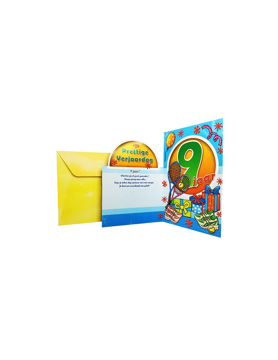 Neun Jahre alt, was für ein Abenteuer für ein Kind! Schicken Sie diesem Kind, das Sie lieben, zu seinem 9. Geburtstag diese Geburtstagskarte! Feiern Sie dieses Ereignis im Retro-Stil mit dieser Grußkarte, die mit Glitzer und Glanzeffekten verziert ist. Der Ausschnitt der Karte ist originell und hebt die Anzahl der gefeierten Jahre hervor. Neben einem kleinen, liebevollen Text im Inneren haben Sie auch Platz für ein paar persönliche Worte. Die Karte wird mit einem passenden Umschlag geliefert. Der Text ist nur auf Niederländisch verfügbar.
