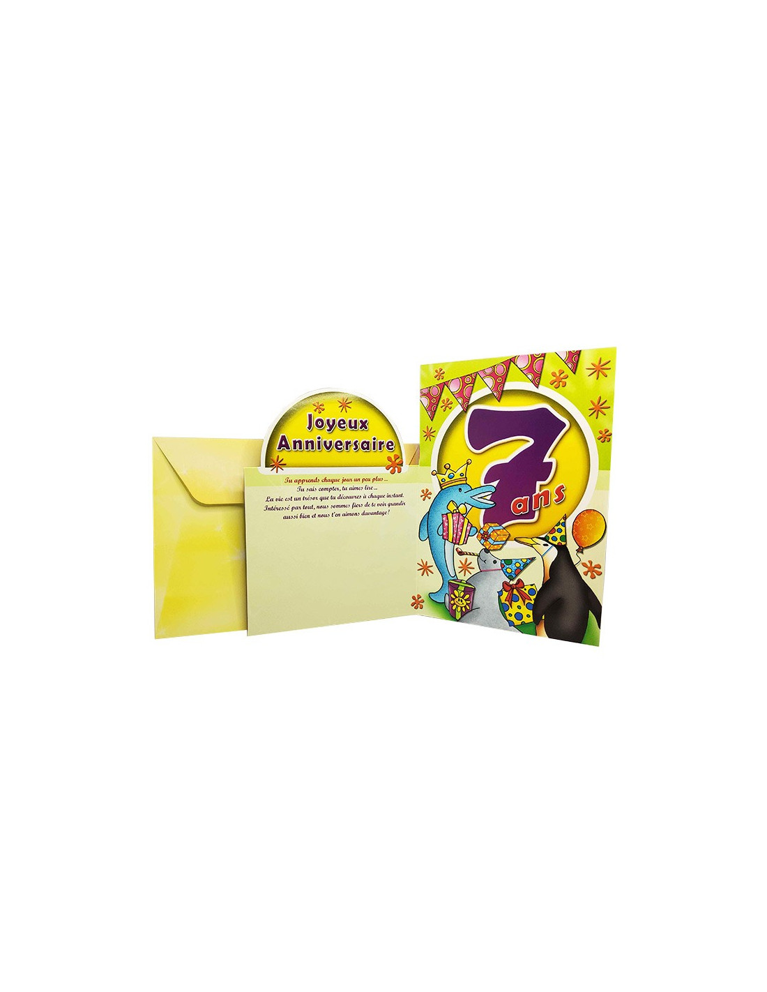 Feiern Sie den 7. Geburtstag eines Kindes mit dieser Geburtstagskarte. Feiern Sie dieses Ereignis im Retro-Stil mit dieser Grußkarte, die mit Glitzer und einem Glanzeffekt verziert ist. Der Ausschnitt der Karte ist originell und hebt die Anzahl der gefeierten Jahre hervor. Neben einem kleinen, liebevollen Text im Inneren haben Sie auch Platz für ein paar persönliche Worte. Die Karte wird mit einem passenden Umschlag geliefert. Der Text ist nur auf Französisch verfügbar.