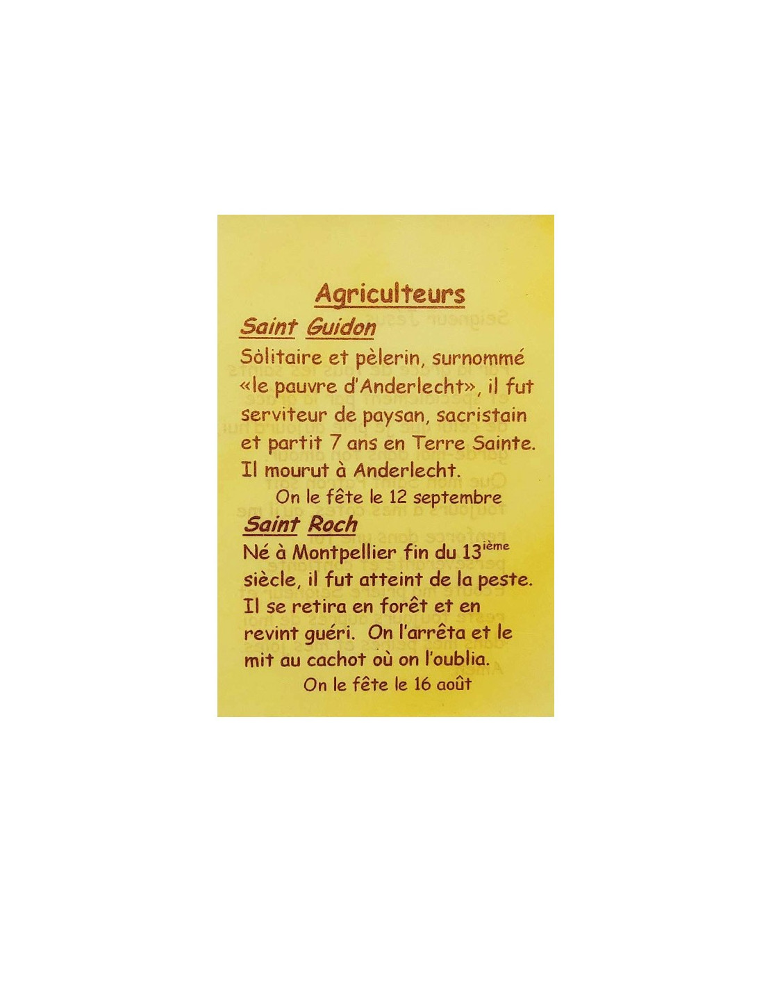 Diese Karte ist ein kleines, diskretes Hilfsmittel, um zu Ihren Schutzheiligen zu beten. Sie richtet sich an Landwirte und alle, die mit diesem Beruf zu tun haben, und erklärt in wenigen Worten ihre Schutzheiligen: den Heiligen Guidon und den Heiligen Roch. Auf der Rückseite steht ein kurzes Gebet, das Jesus und den Schutzheiligen gewidmet ist, um Trost in der Mühe zu spenden, den Glauben zu stärken, Hindernisse zu überwinden und vor den Übeln des Alltags zu schützen.