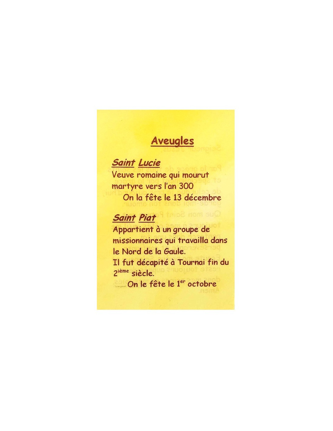 Diese Karte ist ein kleines, unauffälliges Hilfsmittel, um zu Ihren Schutzheiligen zu beten. Sie ist nützlich für Menschen, die an Blindheit oder Sehschwäche leiden oder mit Blinden arbeiten, und erklärt in wenigen Worten, welche Schutzheiligen ihnen Linderung oder Heilung verschaffen: die Heilige Lucia und der Heilige Piat. Auf der Rückseite steht ein kurzes Gebet, das Jesus und der Gnade der Schutzheiligen gewidmet ist, um Trost in den Anstrengungen zu spenden, den Glauben zu stärken, Hindernisse zu überwinden und vor den Übeln des Alltags zu schützen.