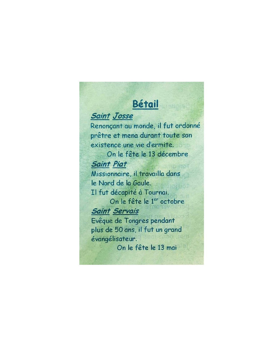 Diese Karte ist ein kleines, diskretes Hilfsmittel, um zu Ihren Schutzheiligen zu beten. Sie richtet sich an Menschen, die Vieh besitzen. Die Karte erklärt in wenigen Worten ihre Schutzheiligen: Saint Josse, Saint Piat und Saint Servais. Auf der Rückseite steht ein kurzes Gebet, das Jesus und der Gnade der Schutzheiligen gewidmet ist, um Trost in den Anstrengungen zu spenden, den Glauben zu stärken, Hindernisse zu überwinden und vor den Übeln des Alltags zu schützen.