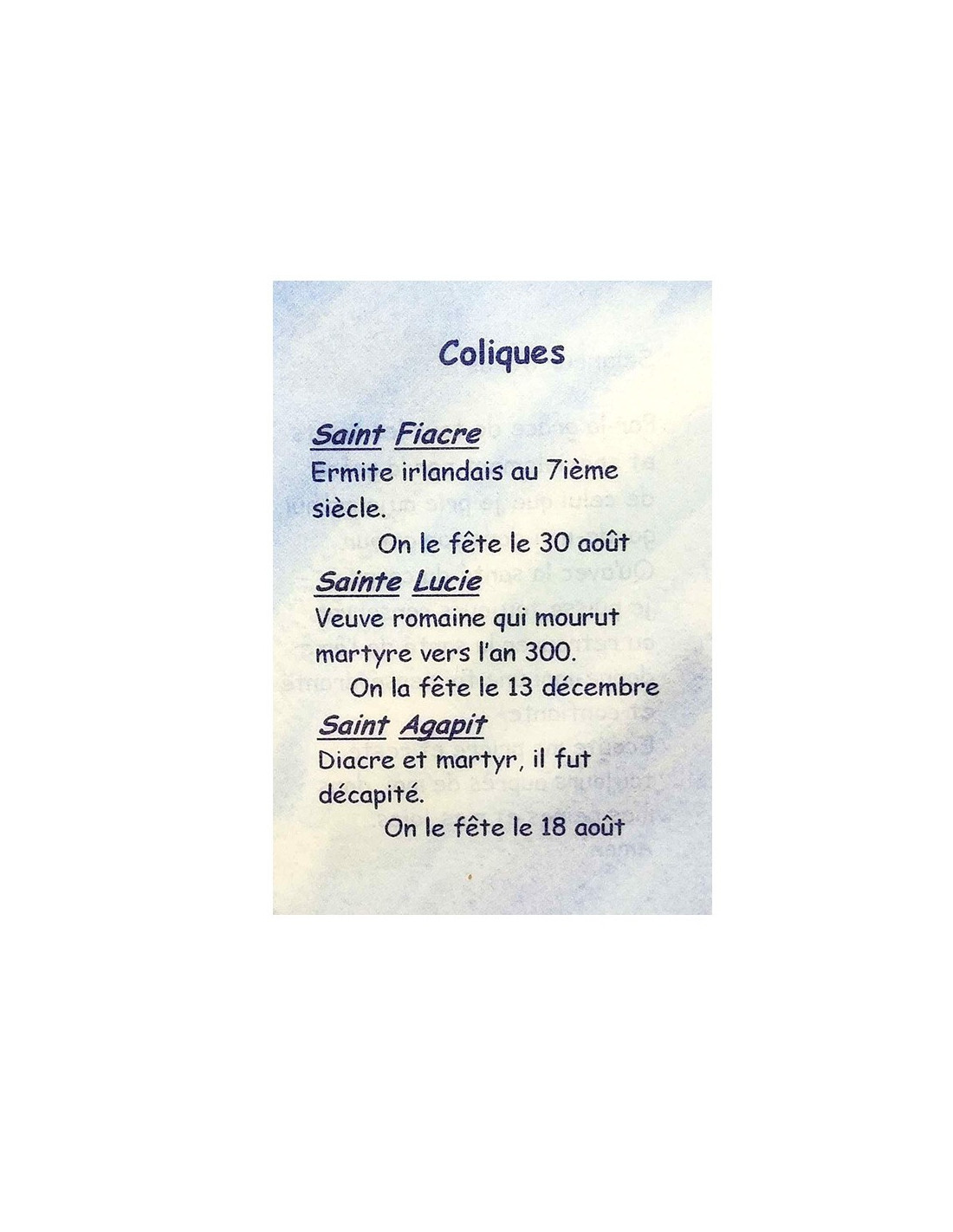 Die Schutzheiligen, die beim Schutz, der Linderung und Heilung von Koliken helfen, sind der Heilige Fiacre, die Heilige Lucia und der Heilige Agapit.