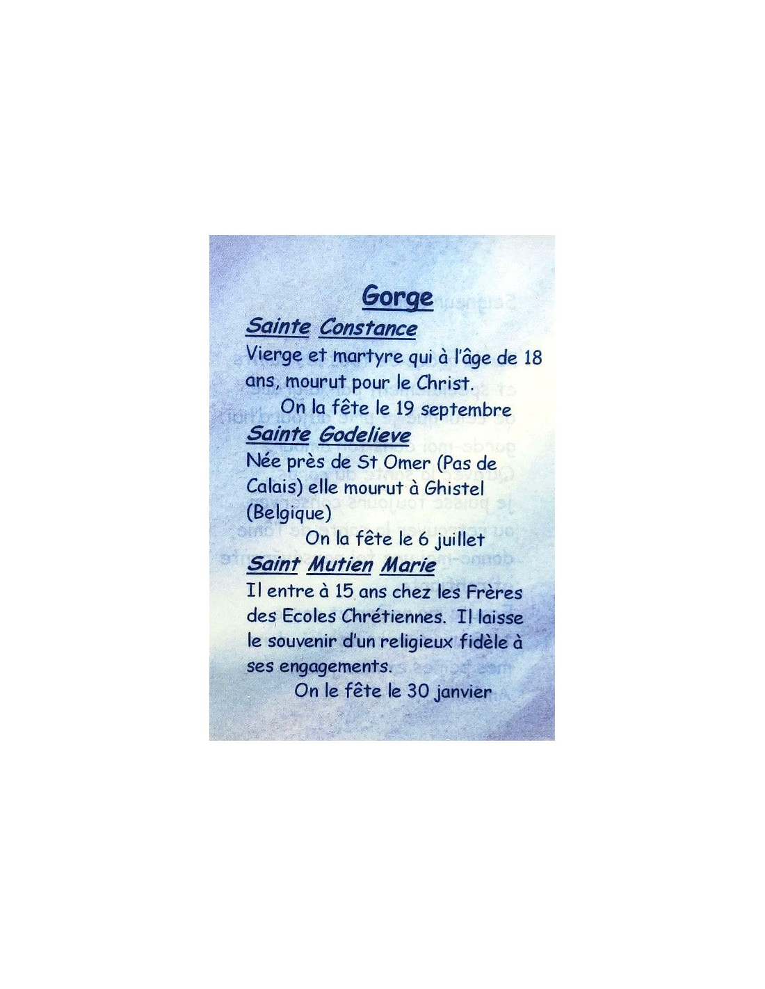 Diese Karte ist ein kleines, unauffälliges Hilfsmittel, um zu Ihren Schutzheiligen zu beten. Sie ist nützlich für den Hals und erklärt in wenigen Worten die Schutzheiligen, die helfen, Krankheiten in diesem Bereich des Körpers zu lindern oder zu heilen: Heilige Constance, Heilige Godelieve und Heiliger Mutien Marie. Auf der Rückseite steht ein kurzes Gebet, das Jesus und der Gnade der Schutzheiligen gewidmet ist, um in den Anstrengungen zu trösten, den Glauben zu stärken, Hindernisse zu überwinden und vor den Übeln des Alltags zu schützen.
