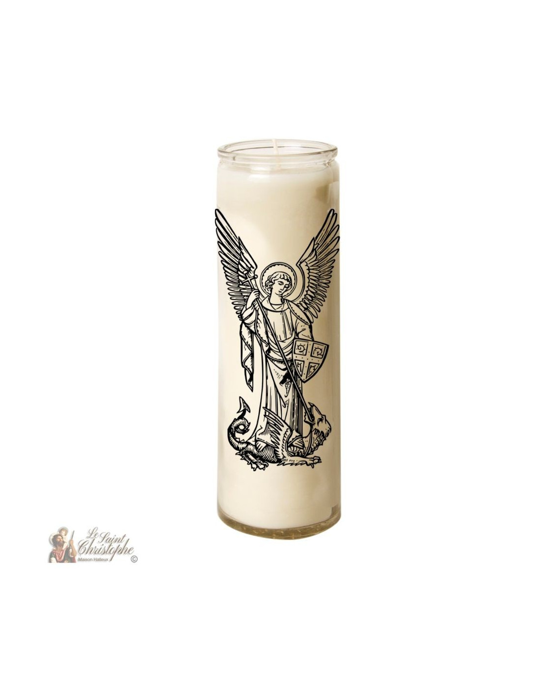 Weiße Kerze im Glas St. Michael Erzengel Schwarze Zeichnung