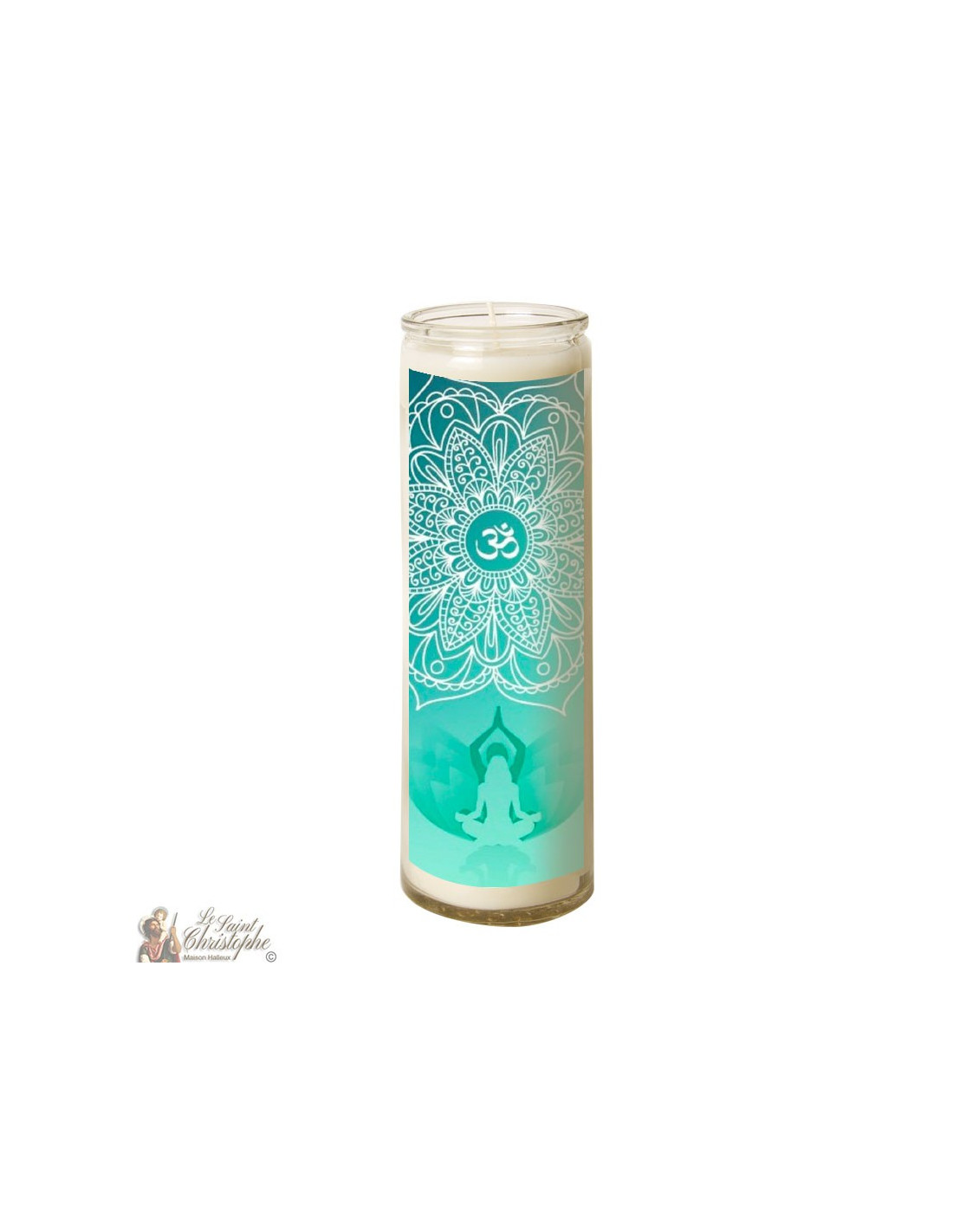 Mit dem Bild des Symbols OM oder AUM, umgeben von einem Mandala auf türkisfarbenem Hintergrund als Dekoration, kann diese Kerze zum Gebet, zur Meditation, zur Dekoration oder auch zur Esoterik verwendet werden.