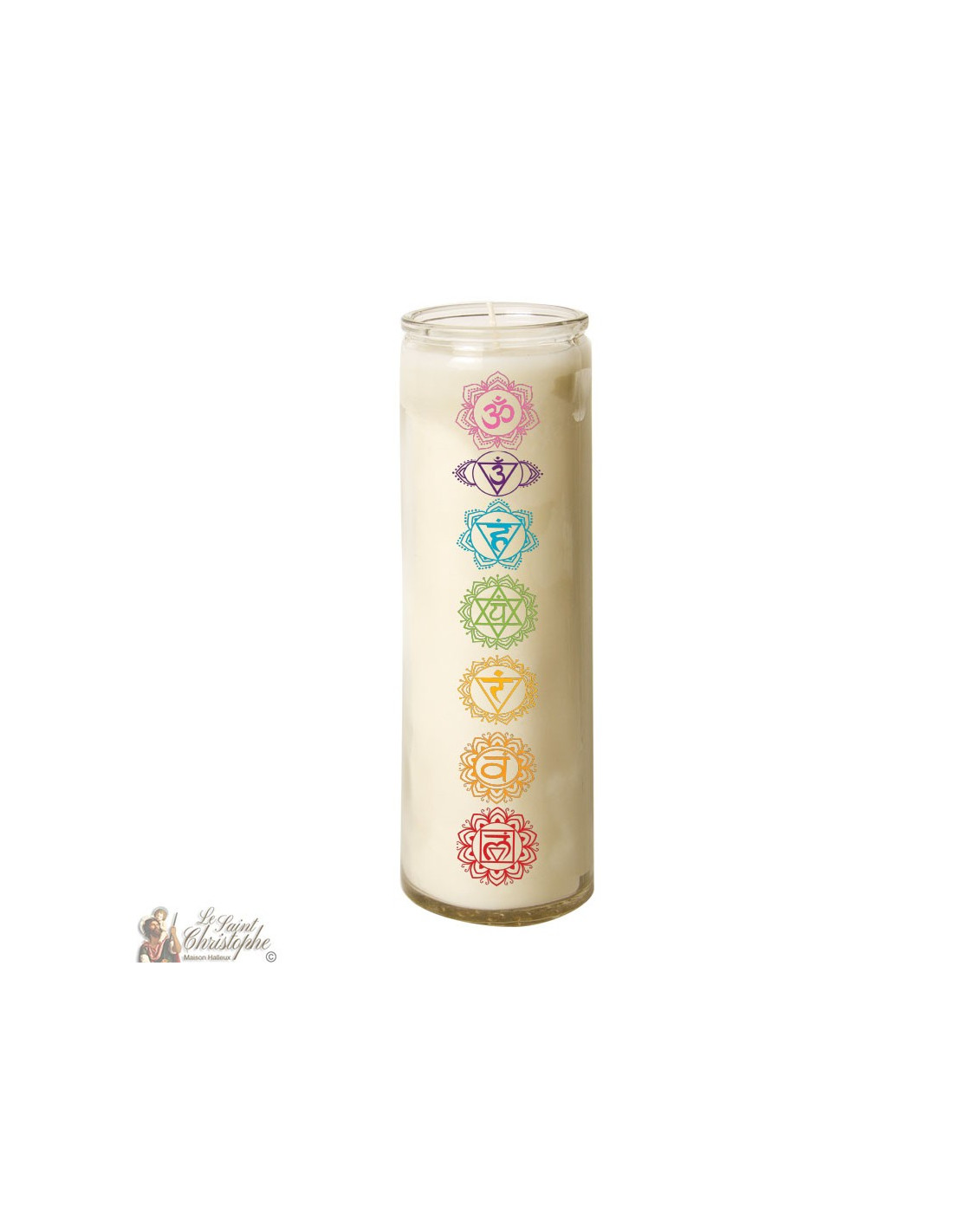 Mit den Symbolen der sieben Hauptchakren dekoriert, kann diese Kerze zum Gebet, zur Meditation, zur Dekoration oder auch zur Esoterik verwendet werden.